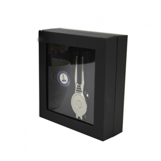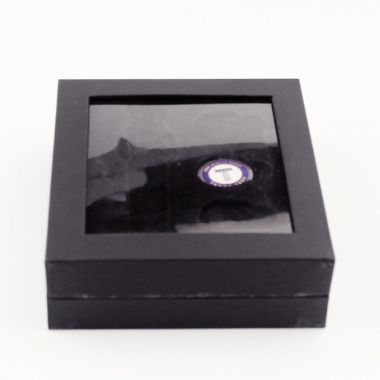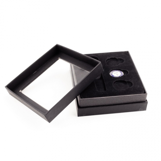 To ozdobne, czarne pudełko tekturowe z przezroczystą pokrywą z PVC, wykonane ze specjalnego czarnego papieru + 2 mm szarej tektury, wewnątrz pokryte czarną aksamitną tkaniną i wkładem typu blister, co sprawia, że wygląda bardzo ekskluzywnie i luksusowo.