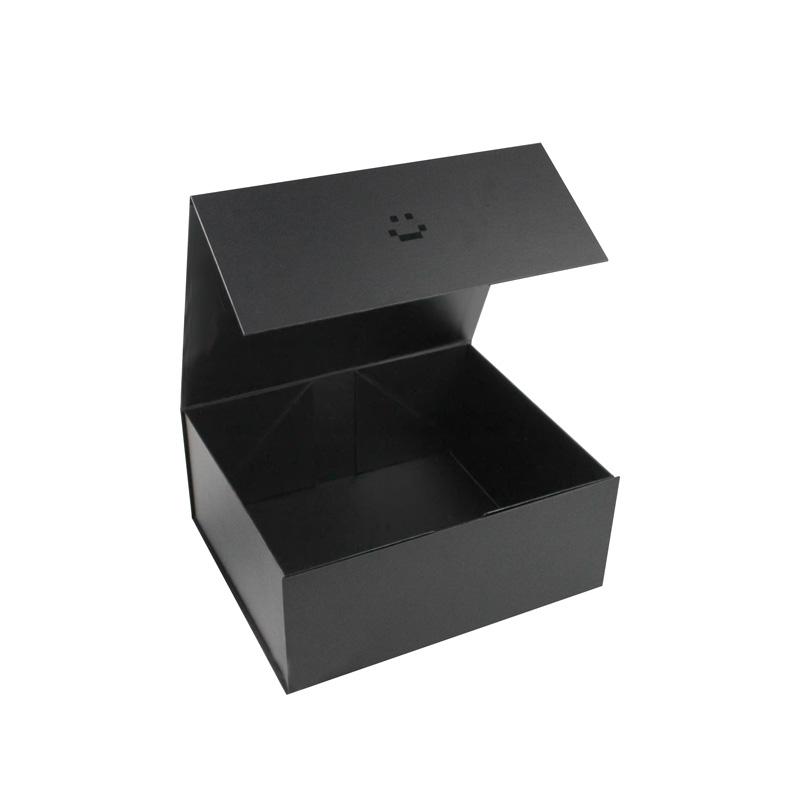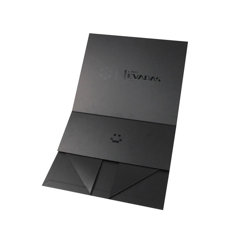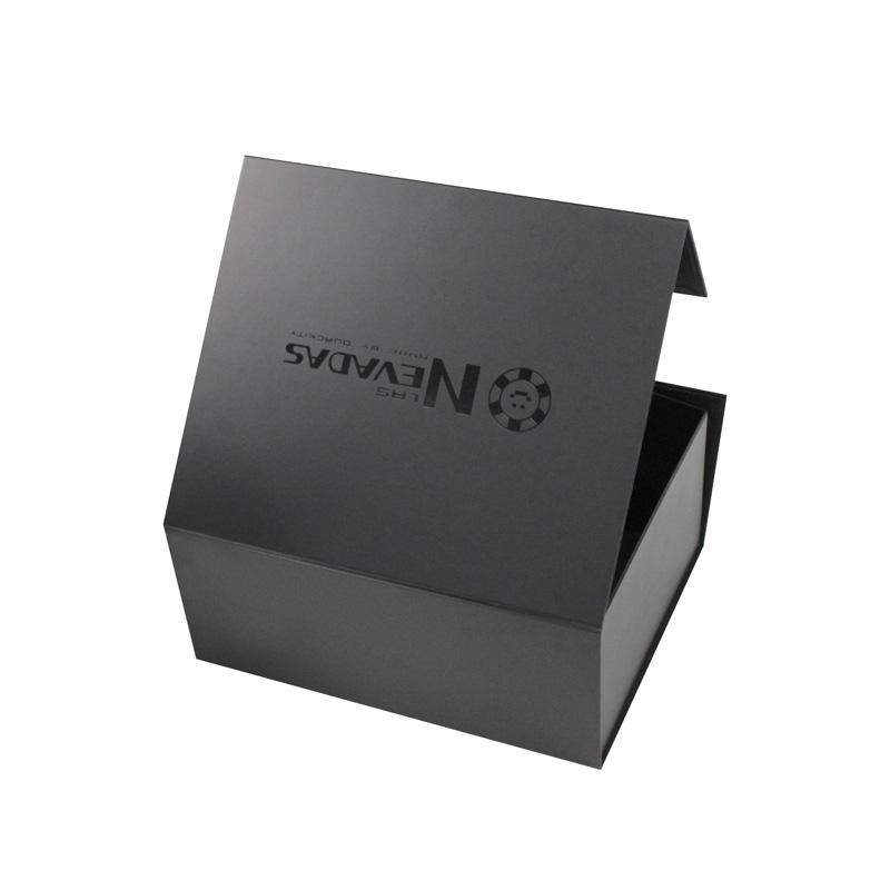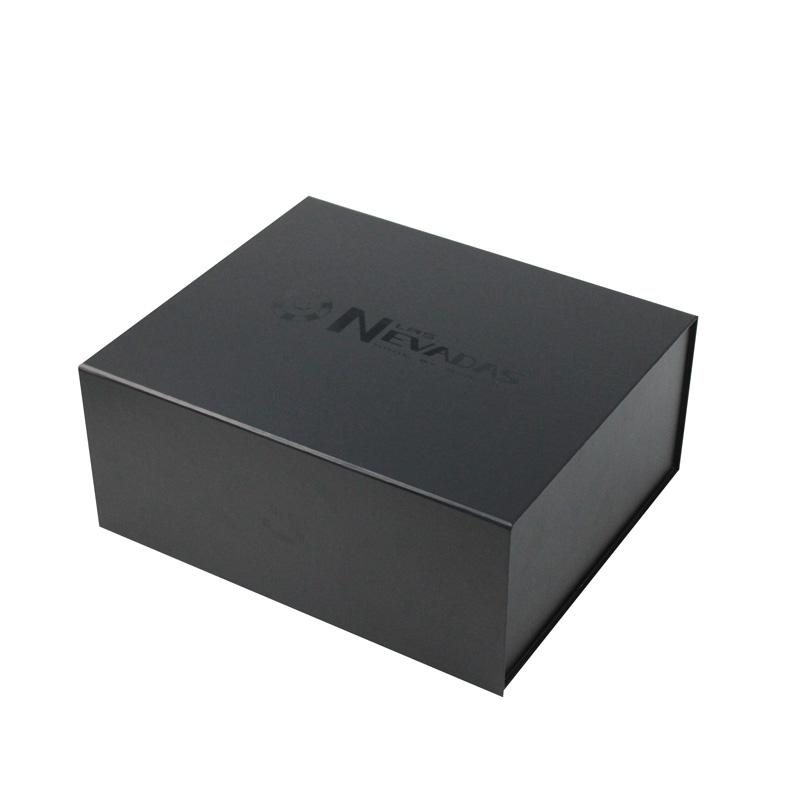 To jest matowy niebieski kolor czarne składane pudełka prezentowe z papieru który zrobił na czarnym papierze specjalistycznym + szarym kartonie 1200g, duże logo wykonane metodą lakierowania UV na wierzchu pokrywy, bez nadruku.