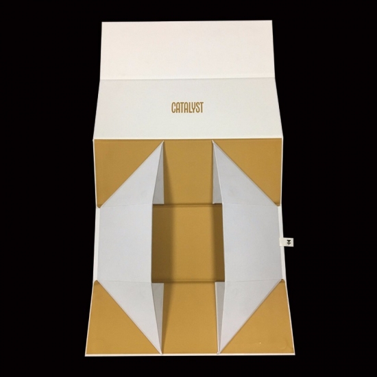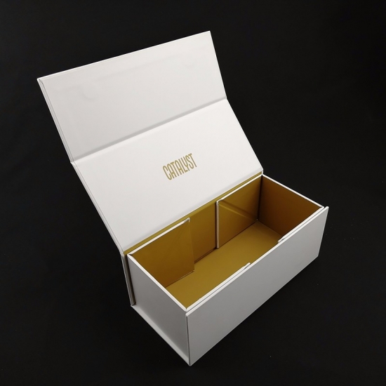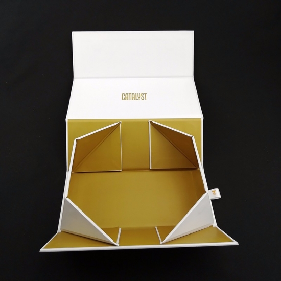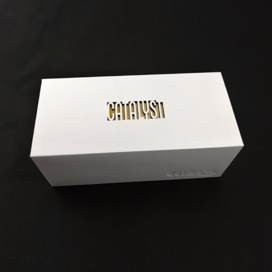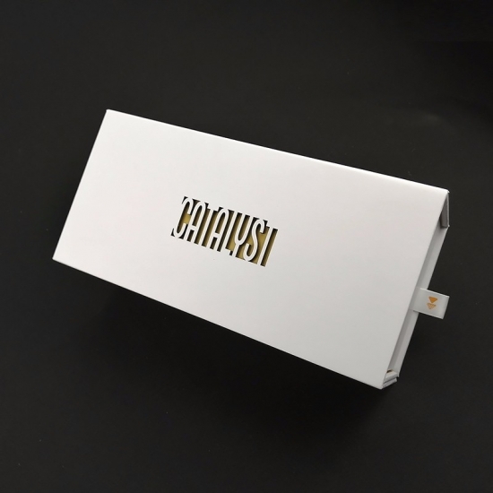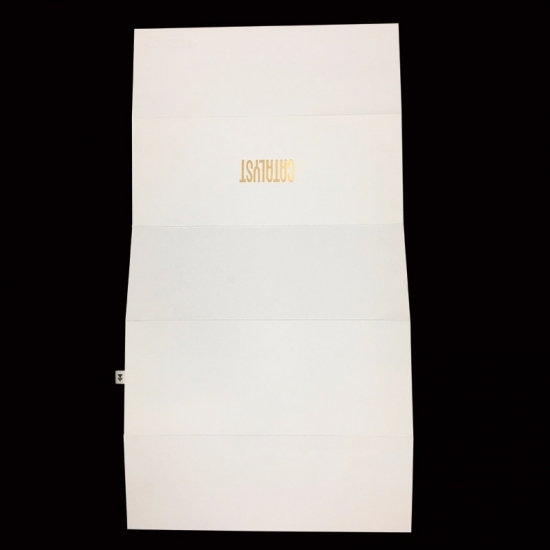 Wykonane ze specjalnego papieru i 2 mm szarego kartonu, na zewnątrz bez nadruku, wewnątrz pełny nadruk w kolorze dodatkowym i wytłoczone logo, złote tłoczenie na gorąco.