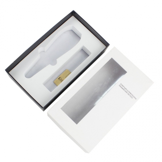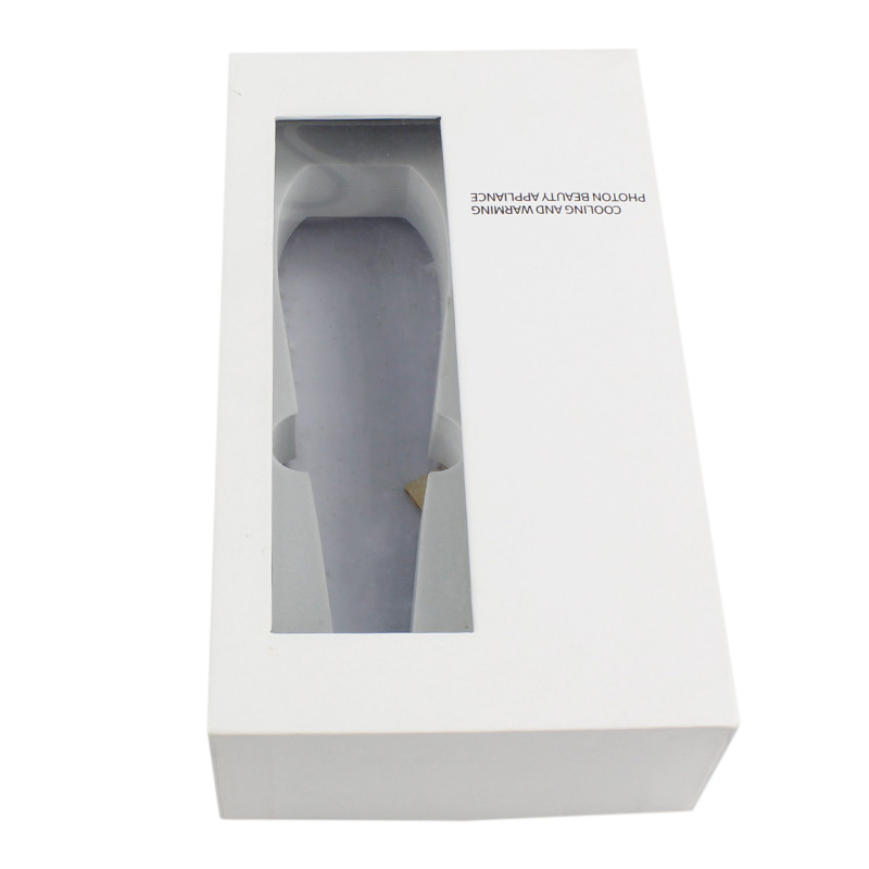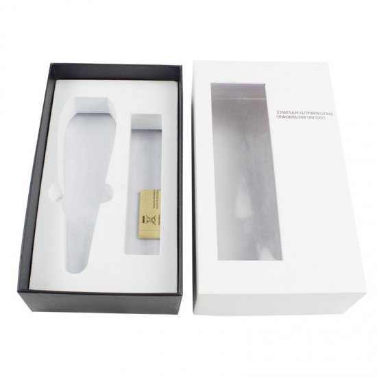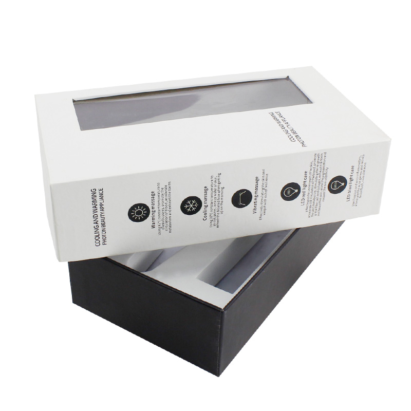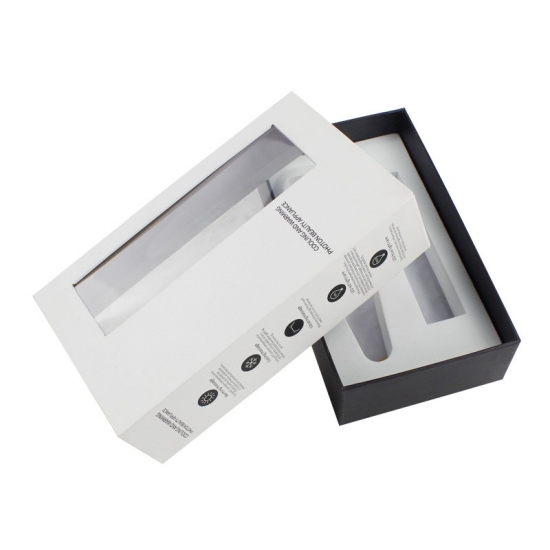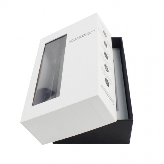 To jest pudełka prezentowe z przezroczystą górą który zrobił wykonany z papieru artystycznego C2S o gramaturze 157 g + szarego kartonu o gramaturze 1200 g, białej pokrywy z przezroczystym okienkiem i czarnej podstawy z niestandardowym tekstem na pudełku, białej pianki EVA wewnątrz pudełka ukształtowanej zgodnie z kształtem produktu.
