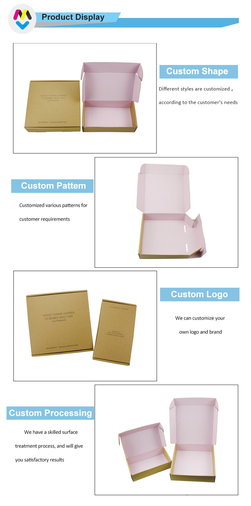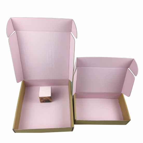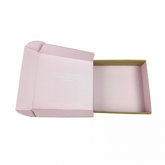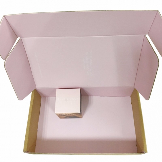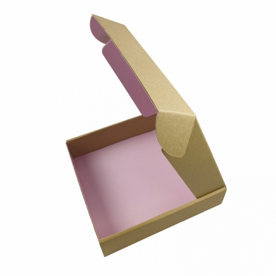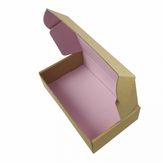 To jest tekturowe pudełka wysyłkowe do przechowywania który został wykonany przez BE flute+ 250g CCNB To proste i łatwe w wykonaniu pudełko pocztowe wykonane z papieru typu kraft na zewnątrz, z czarnym logo i pełnym różowym nadrukiem wewnątrz pudełka