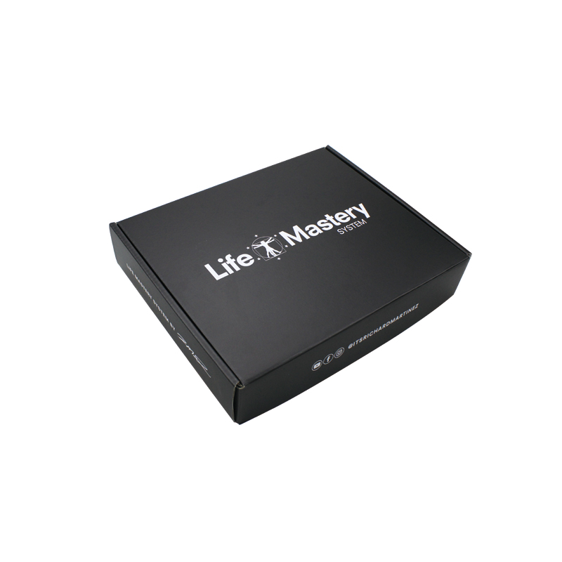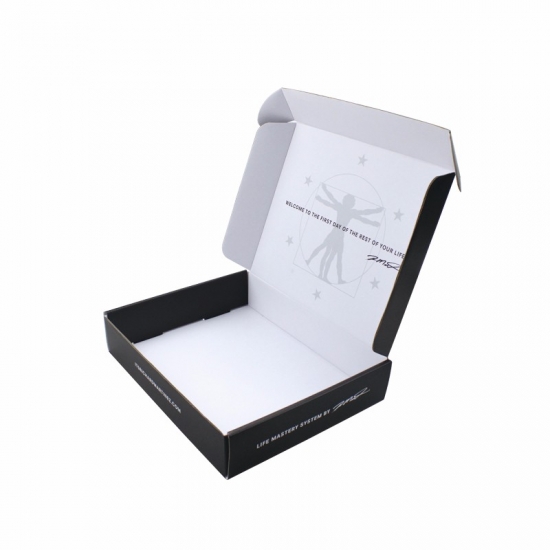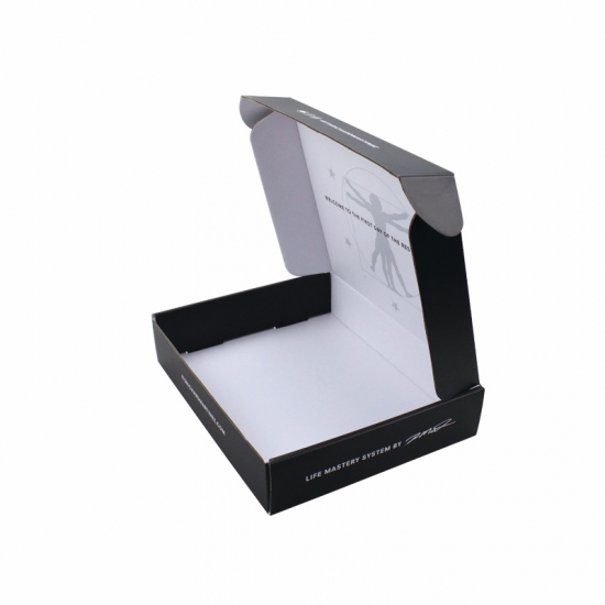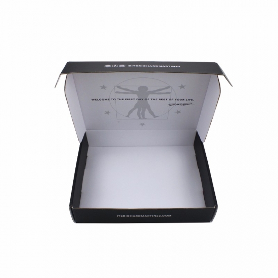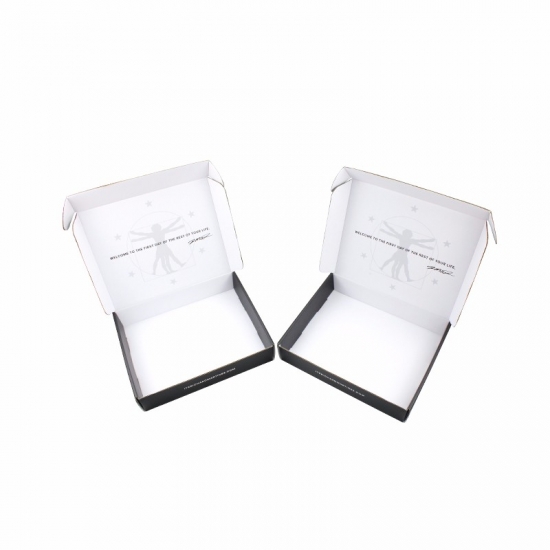 To jest czarne pudełka do pakowania który został wykonany z 250g CCNB+BE flute+ 250g CCNB To prosta i prosta skrzynka pocztowa, zewnętrzna strona w czarnym kolorze z niestandardowym logo, wewnętrzna strona pudełka w niestandardowym wzorze w kolorze białym.