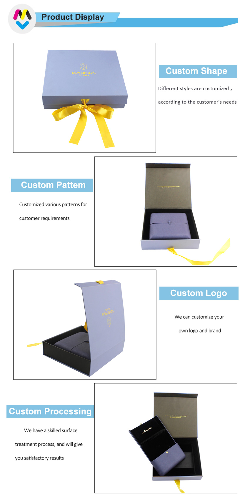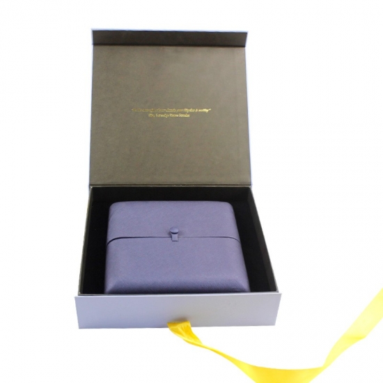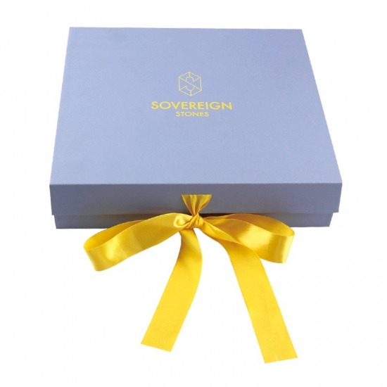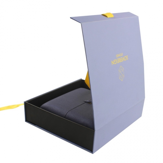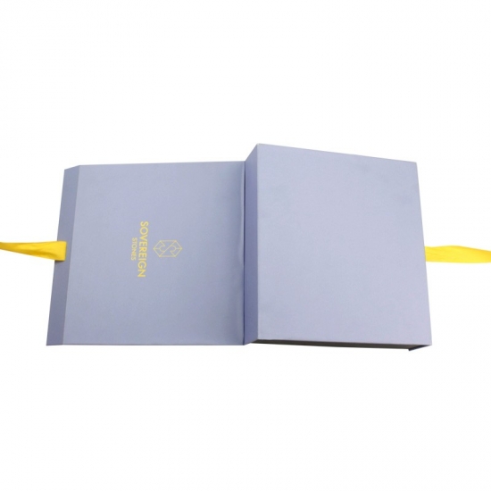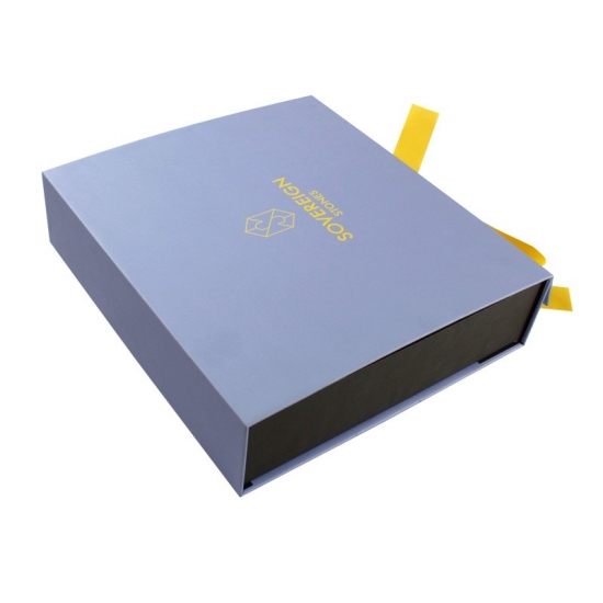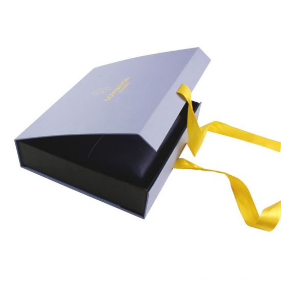 Niebieskie magnetyczne pudełka prezentowe ze wstążką wykonane z papieru artystycznego C2S o gramaturze 157 g/m2 laminowanego 2-milimetrową szarą tekturą z pianką EVA i wstążką, możliwość personalizacji w dowolnym rozmiarze, kolorze i logo, wykończenie powierzchni matową laminacją z tłoczeniem na gorąco, rozmiar 25*23*6 cm