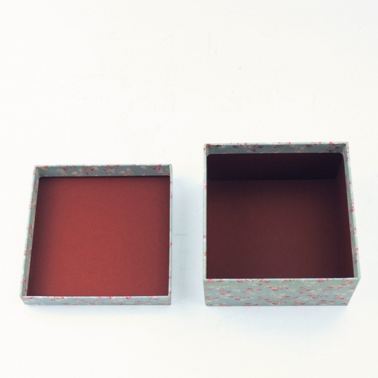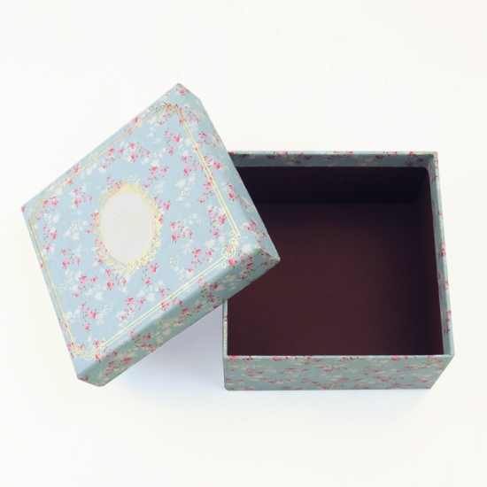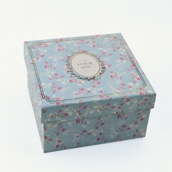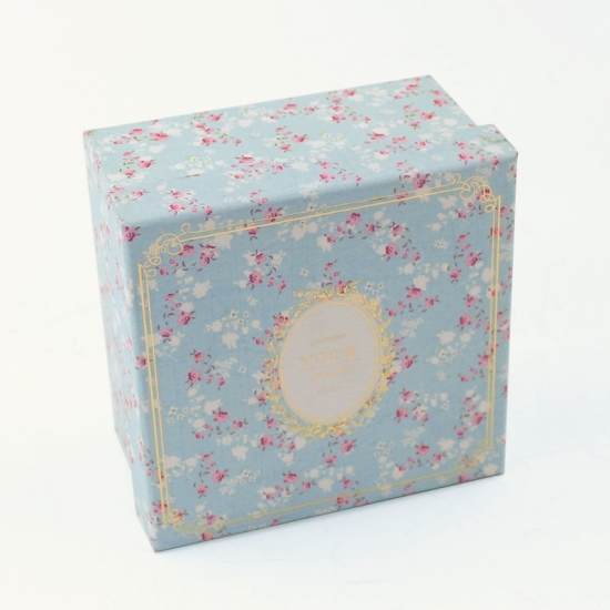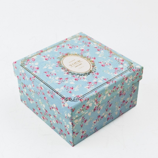 To niestandardowe pudełko prezentowe z romantycznym kwiatowym wzorem w kształcie niebieskich kwadratów, pokrywką i podstawą, wykonane z papieru artystycznego C2S o gramaturze 157 g + szarego kartonu o gramaturze 1200 g, z nadrukowanym na gorąco złotym logo, wewnątrz gładki czerwony kolor dekoracyjny. Wymiary: 12 x 12 x 12 cm.