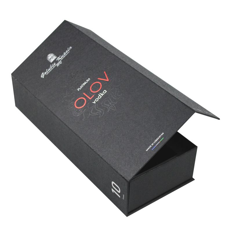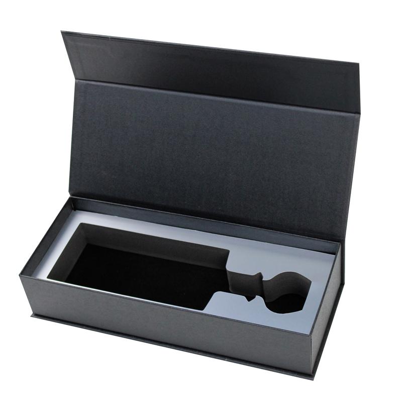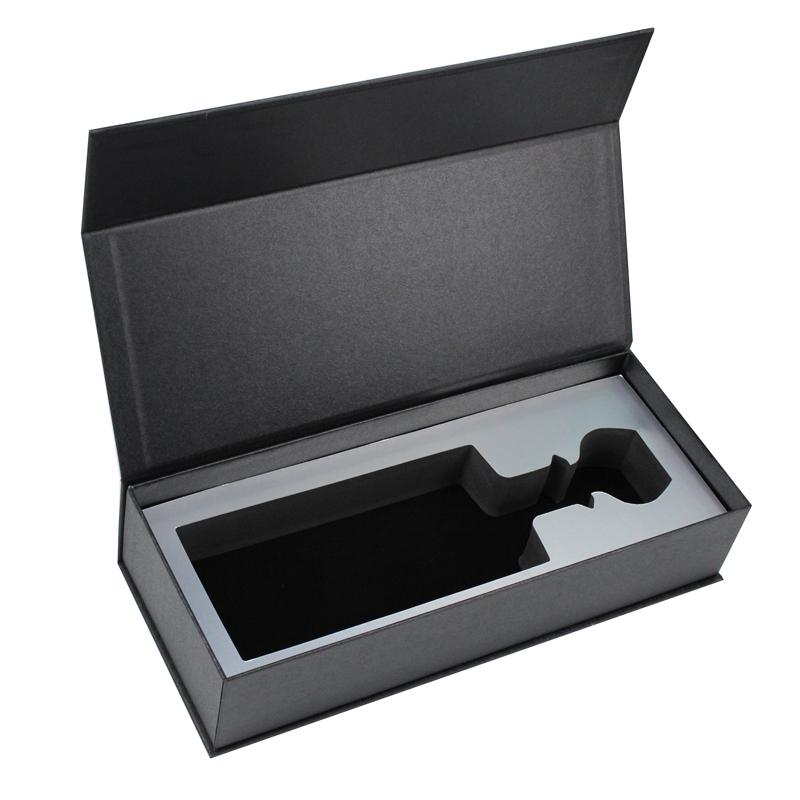 3. materiał pudełka: Papier specjalny w kolorze czarnym 120 g/m2 + 2 mm szara tektura falista + pianka EVA pokryta srebrną folią + silny magnes