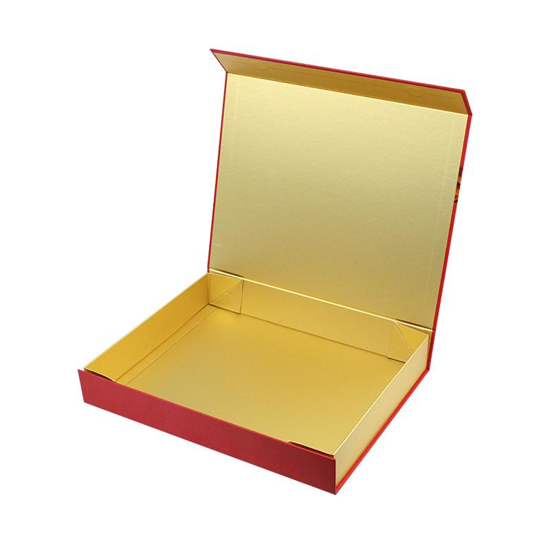 2. materiał pudełka: Papier metaliczny w kolorze złotym 152 g/m2, oprawiona 2 mm podwójnie szara tektura z papierem artystycznym C2S 157 g/m2 + silne magnesy