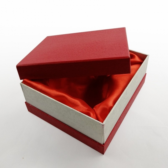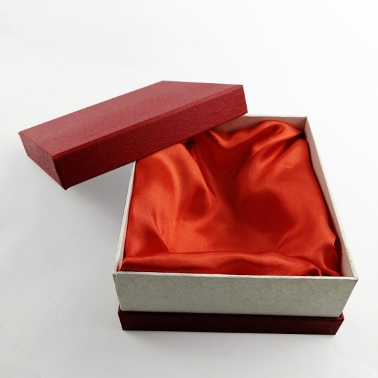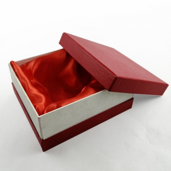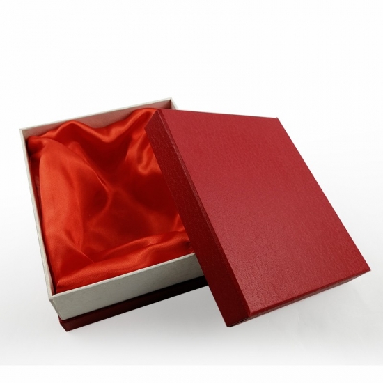 To duże, ozdobne, złote, kwadratowe, czerwone pudełko prezentowe z pokrywkami, wykonane ze specjalnego papieru o fakturze, wewnątrz wyłożone satynową tkaniną i wypełnione pianką. Wymiary: 12x12x6 cali.