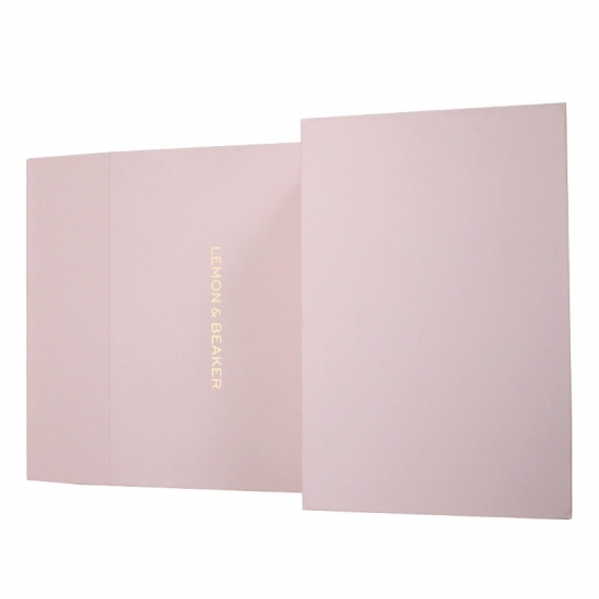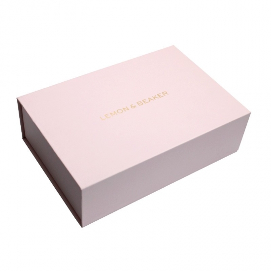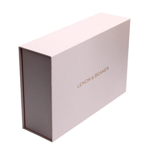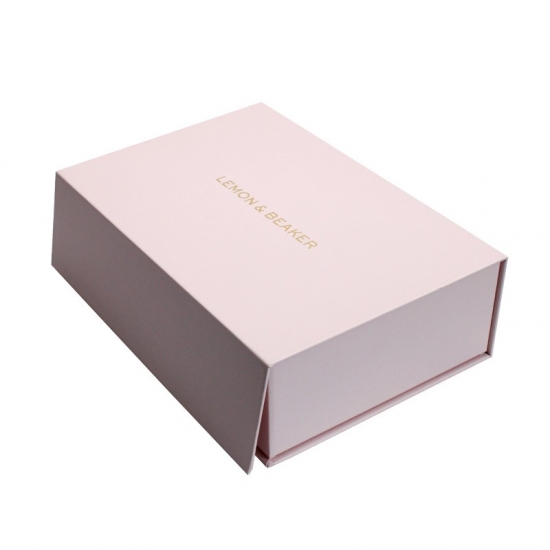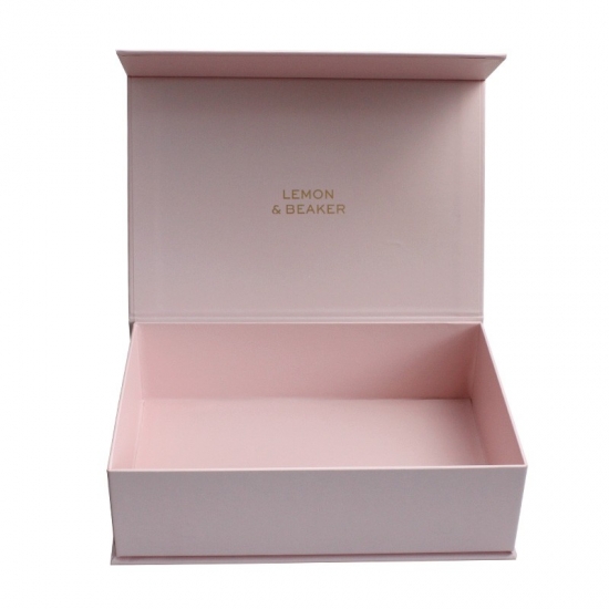 Różowe magnetyczne pudełko prezentowe wykonane z papieru artystycznego C2S o gramaturze 157 g/m2 laminowanego 2 mm szarą tekturą, laminowane matowo, z gorącym tłoczeniem w kolorze różowym