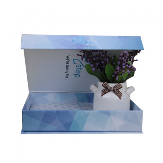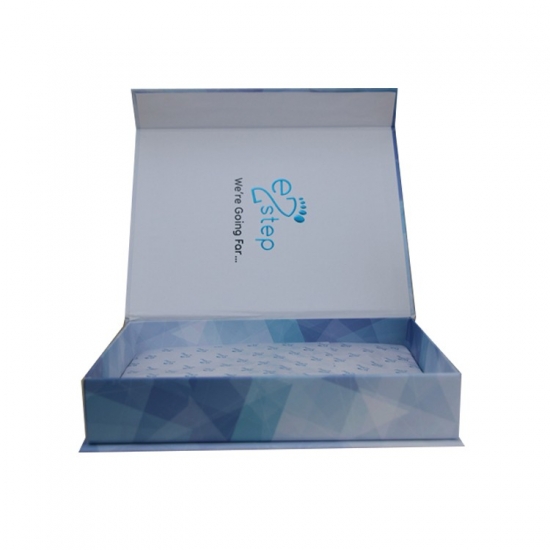 Niebieskie pudełko do przechowywania w kształcie książki wykonane z papieru artystycznego C2S o gramaturze 157 g/m2 laminowanego 2-milimetrową szarą tekturą, dostosowane do dowolnego rozmiaru, koloru i logo, wykończenie powierzchni matową laminacją, punktowe lakierowanie UV, tłoczenie na gorąco (w kolorze niebieskim), rozmiar tłoczenia 20,1*16,1*4,1 cm
