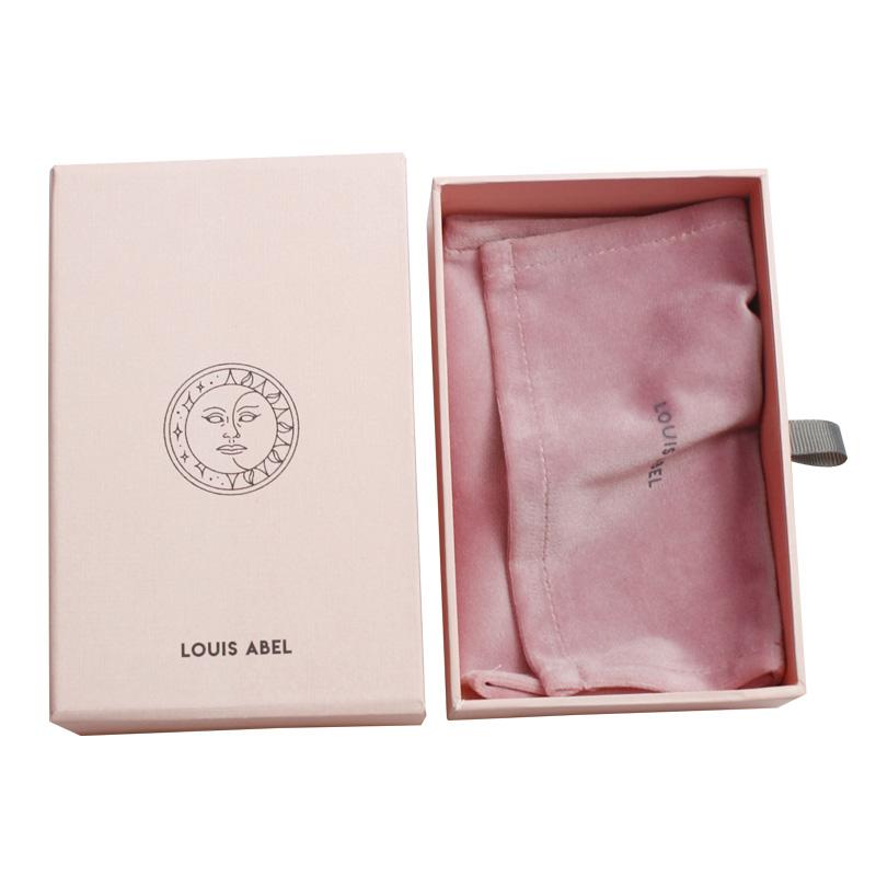 Niestandardowe różowe pudełko na biżuterię z szufladą i woreczkiem, to rodzaj opakowanie prezentowe w formie przesuwanego pudełka.