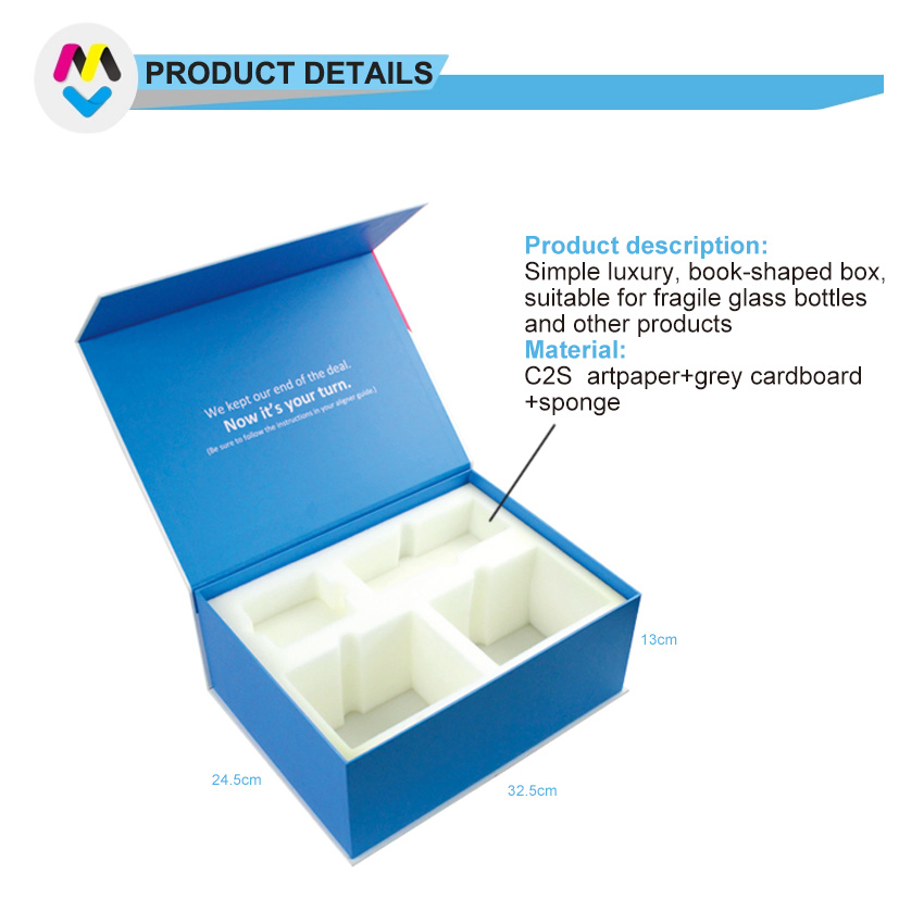 Magnetyczne pudełko prezentowe wykonane z papieru kredowego C2S o gramaturze 157 g/m2, laminowanego szarą tekturą o grubości 2,5 mm. To bardzo magnetyczne pudełko prezentowe z kolorowym nadrukiem i matową laminacją. Jest kolorowe i modne, idealnie pasuje do różnych opakowań kosmetyków.