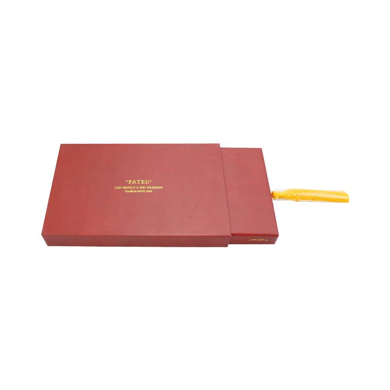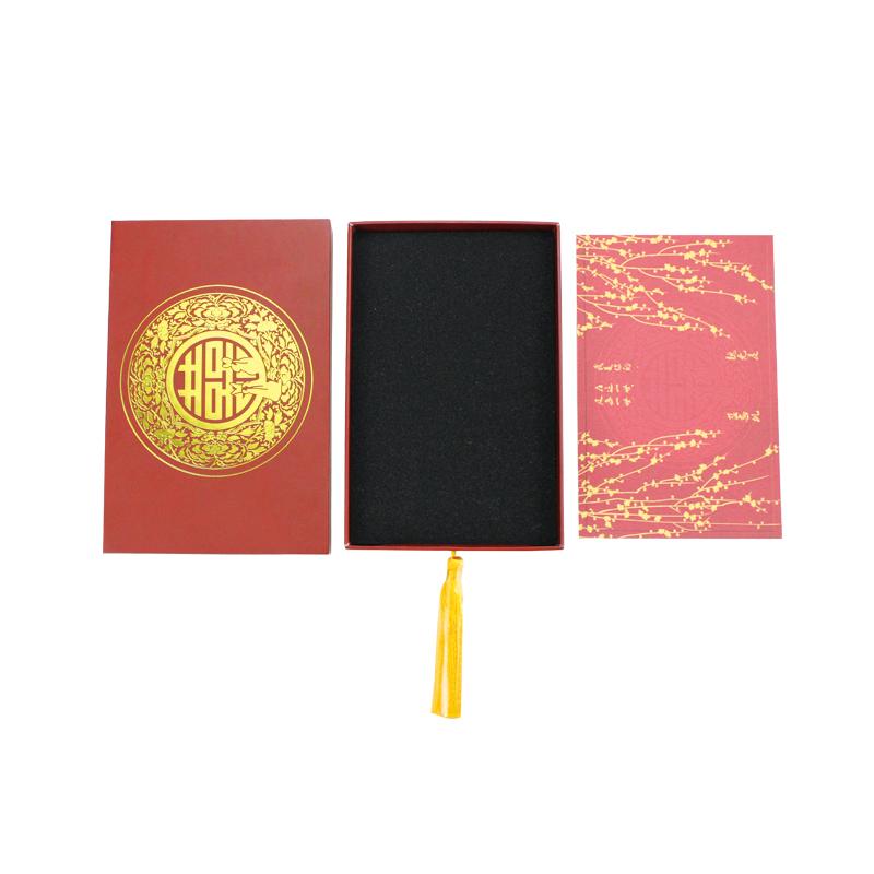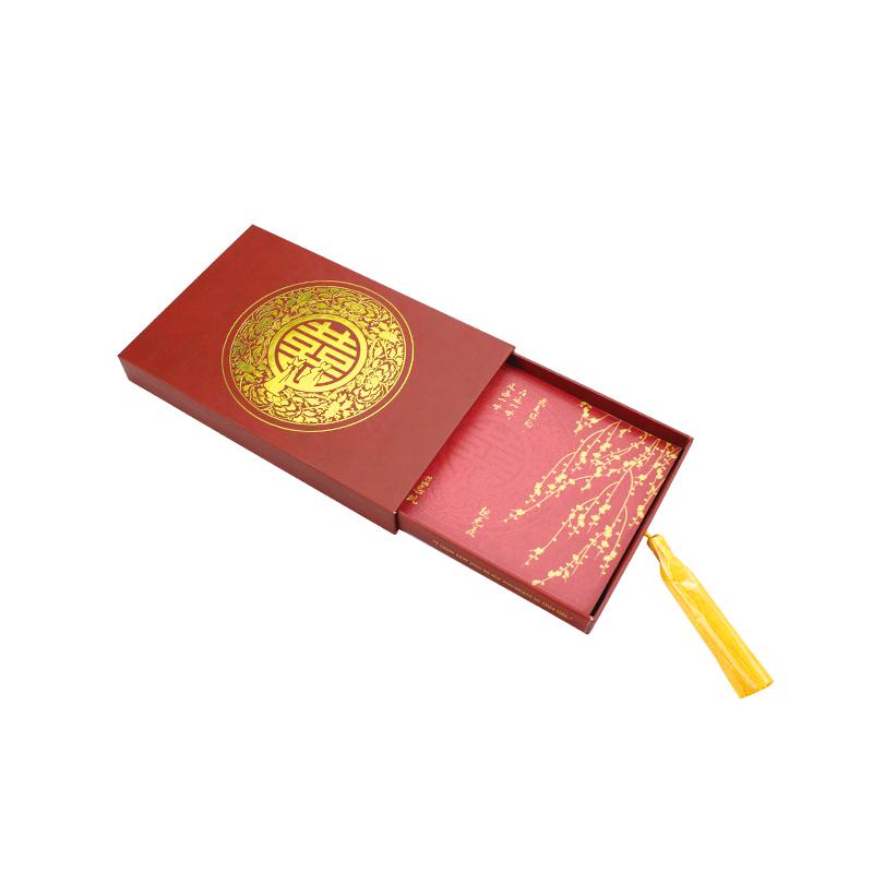 Specjalizujemy się w produkcji wszelkiego rodzaju pudełek papierowych, toreb papierowych i innych produktów papierowych na zamówienie. Oferujemy dowolny kształt, rozmiar, kolor, materiał, wykończenie powierzchni i dowolny wzór. Produkt ma kształt prostokąta, pełny nadruk w kolorze czerwonym, złote logo tłoczone na gorąco, złotą wstążkę i matowe wykończenie powierzchni laminowanej. Produkt jest zazwyczaj używany na festiwalach i zaproszeniach ślubnych.