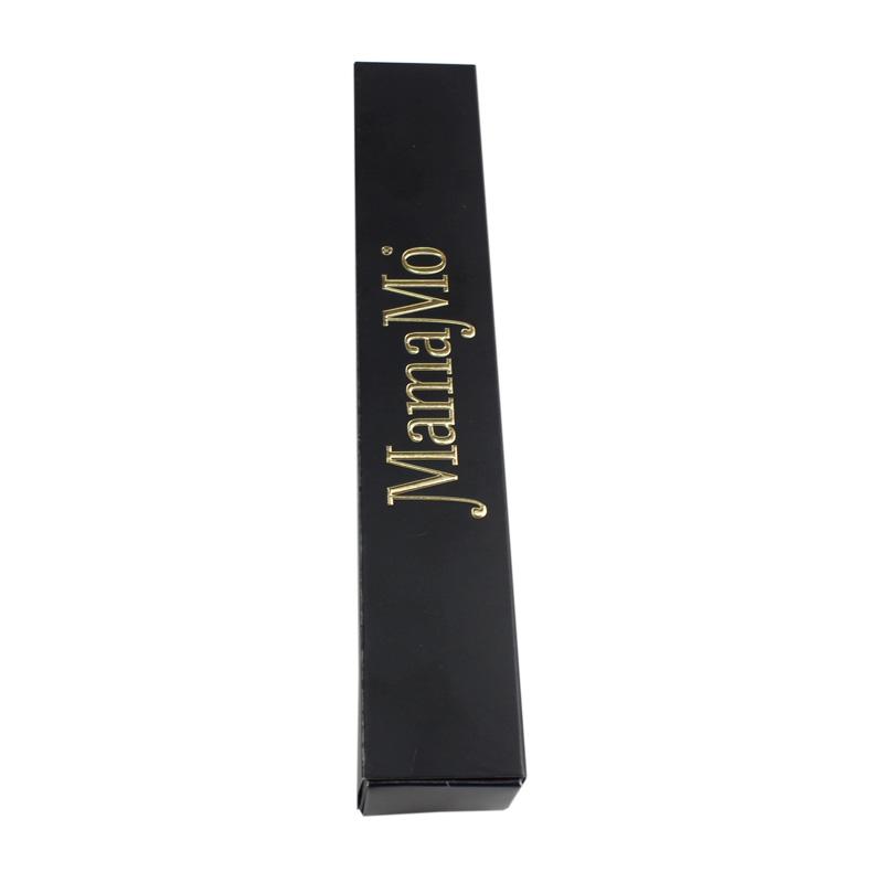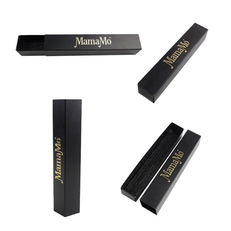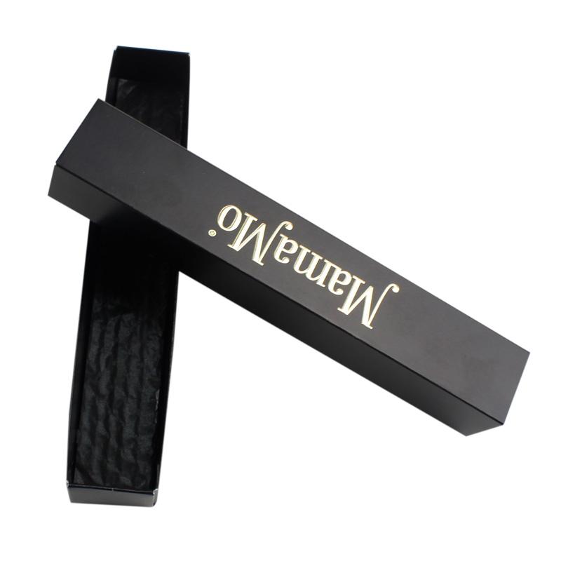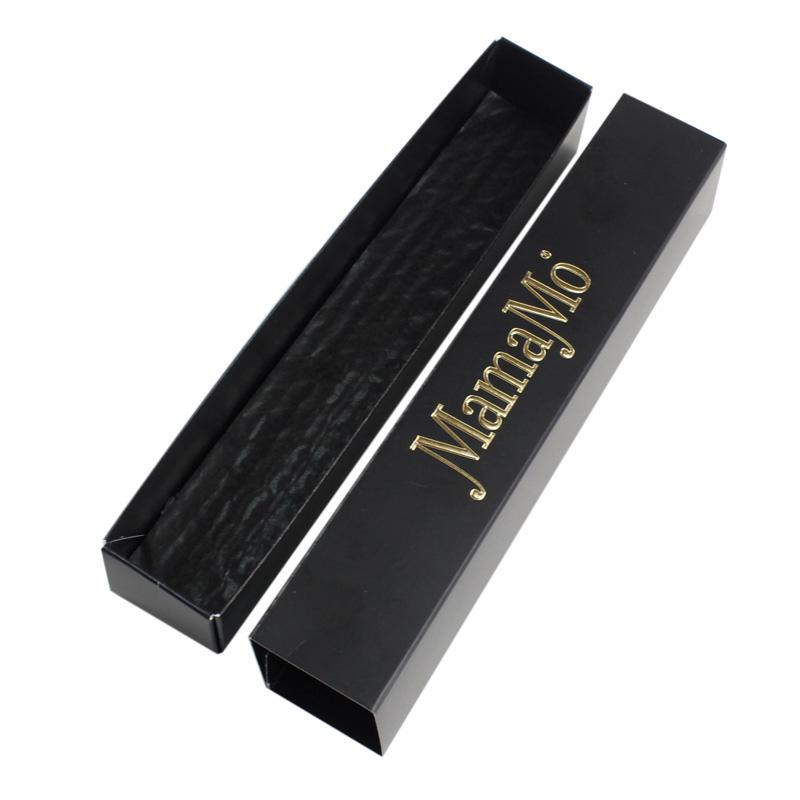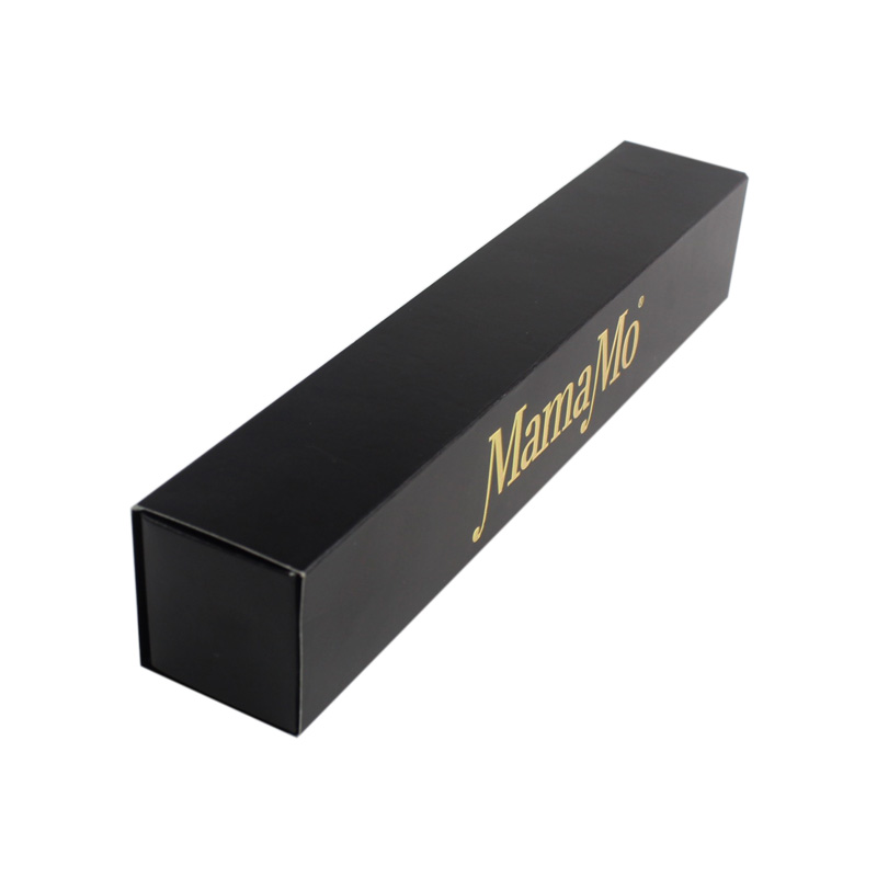 Pudełko tekturowe na przekąski czekoladowe o prostokątnym kształcie, z matowym czarnym nadrukiem i wytłoczonym logo wykonanym złotą folią. To niedrogie i ładne opakowanie.