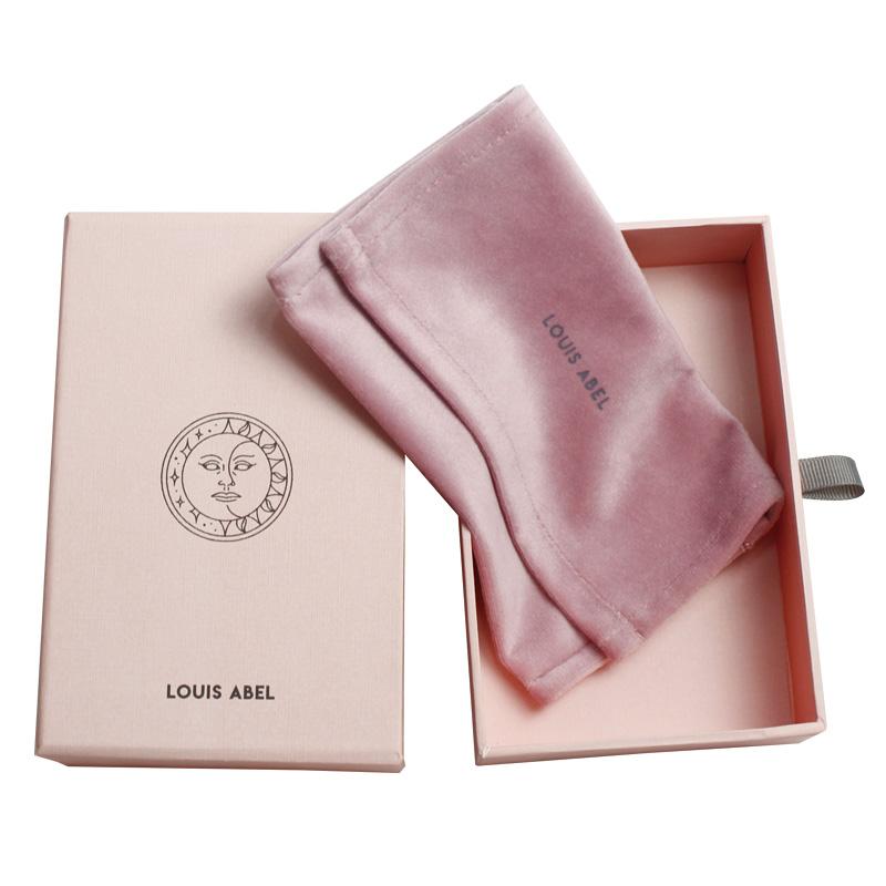 Niestandardowe różowe pudełko na biżuterię z szufladą i woreczkiem, to rodzaj opakowanie prezentowe w formie przesuwanego pudełka.