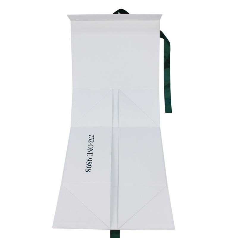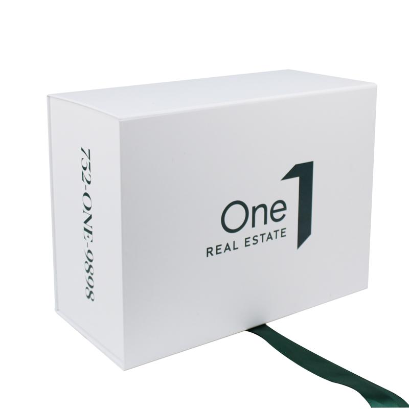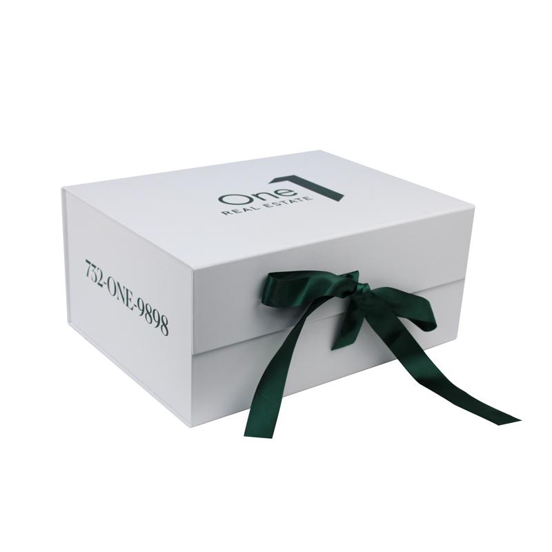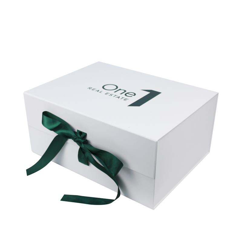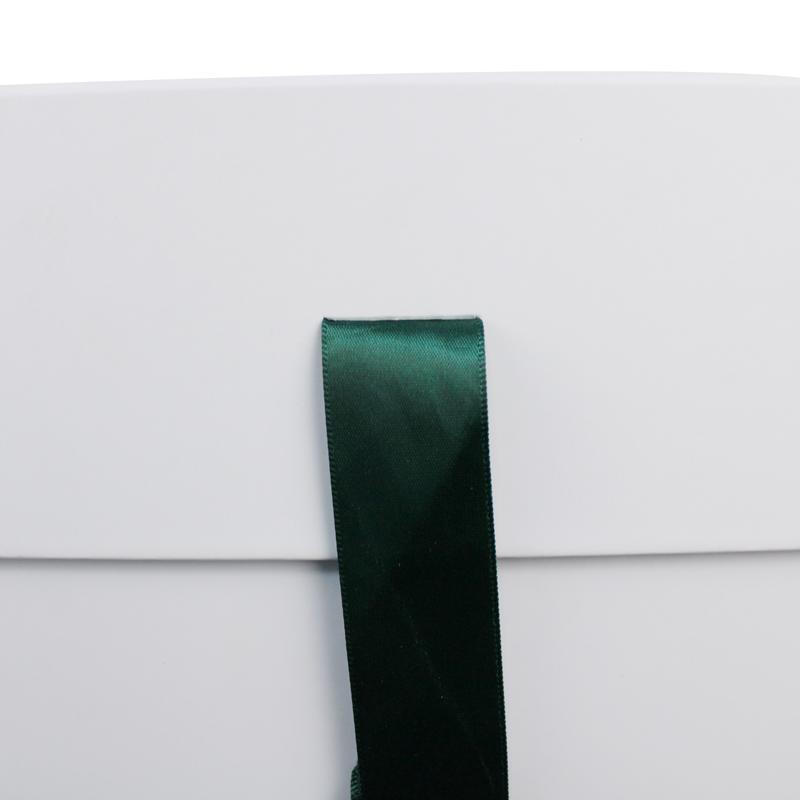 Klasyczny białe pudełko prezentowe ze wstążką , wykonany z najwyższej jakości papieru artystycznego przymocowanego do sztywnego kartonu o gramaturze 1400 g/m2, spersonalizowane logo nadrukowane w kolorze zielonym Pantone, ze wstążką w tym samym kolorze Pantone.