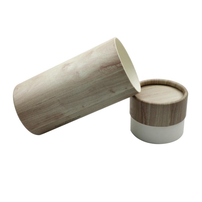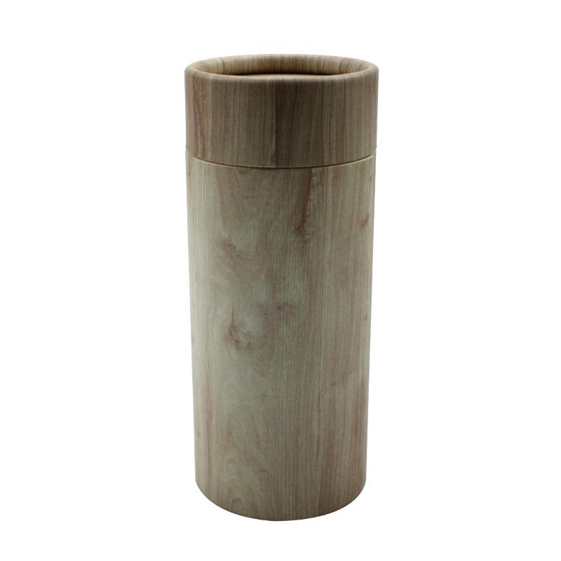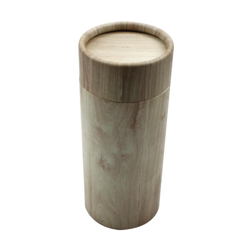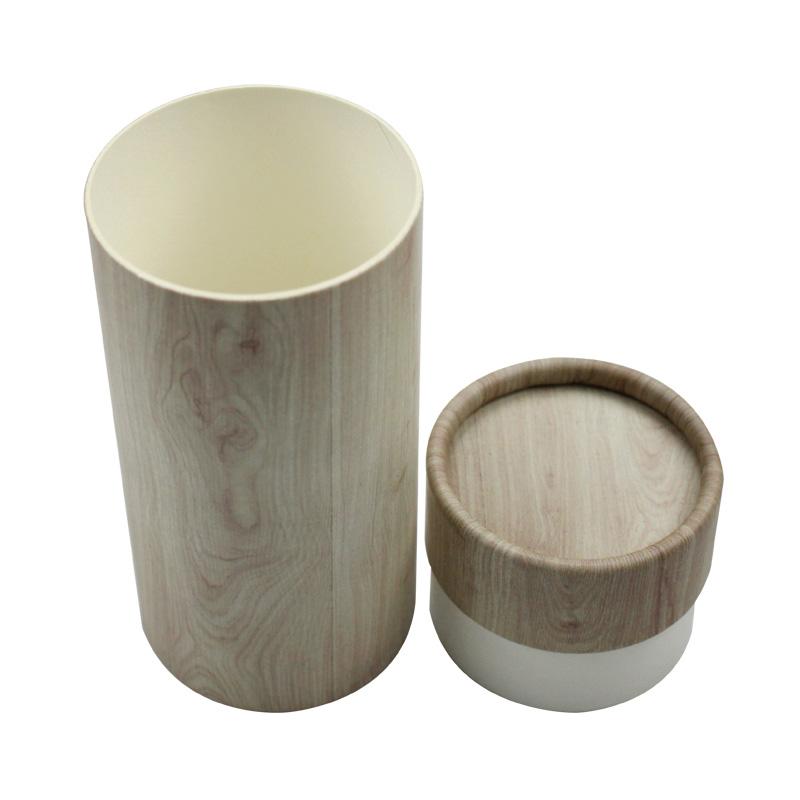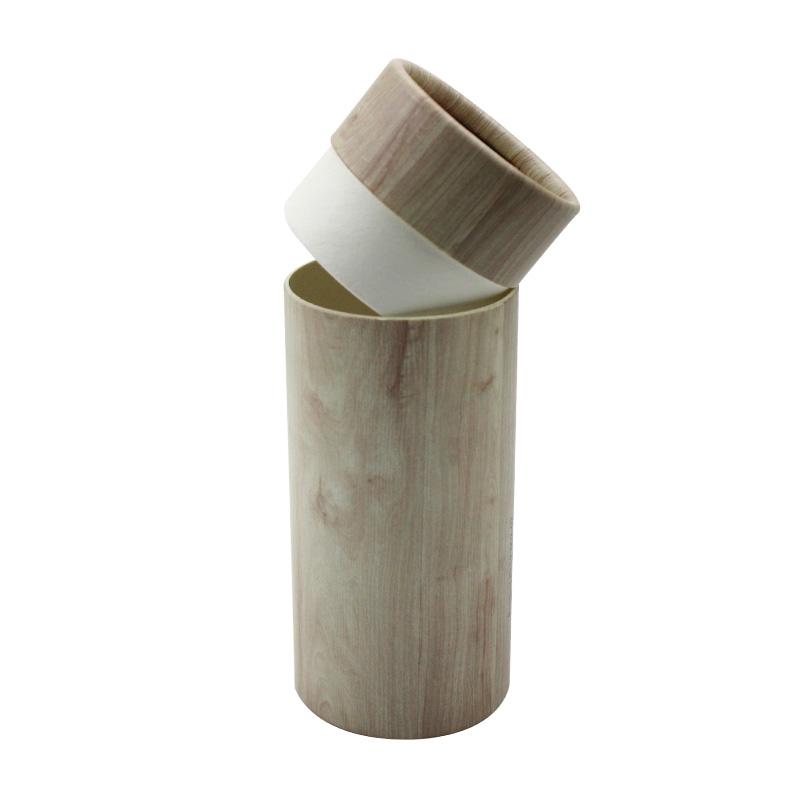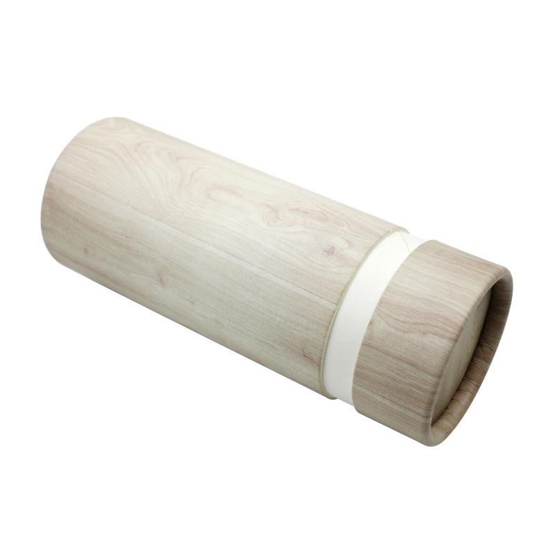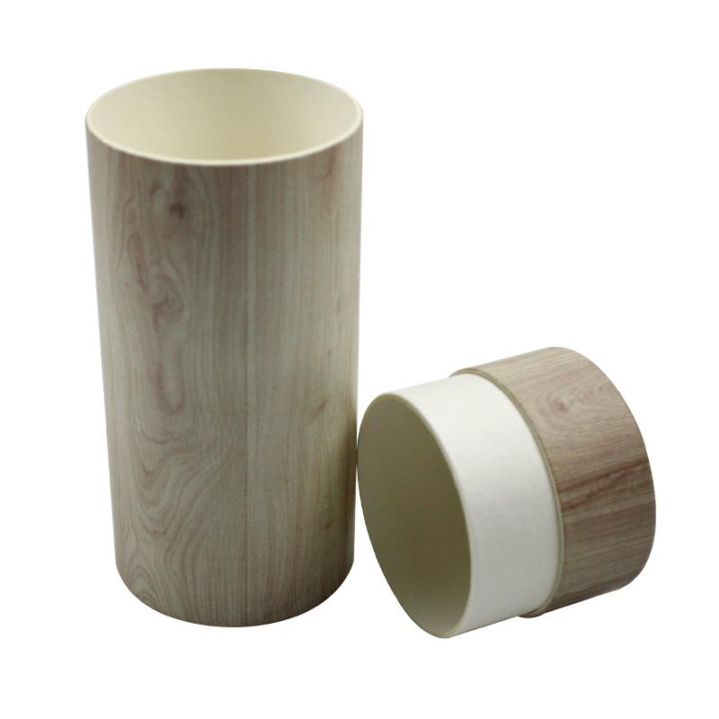 To jest okrągłe pudełko prezentowe z pokrywką Wykonane ze specjalnego papieru o strukturze drewna. Wygląda jak ekskluzywne drewniane pudełko.