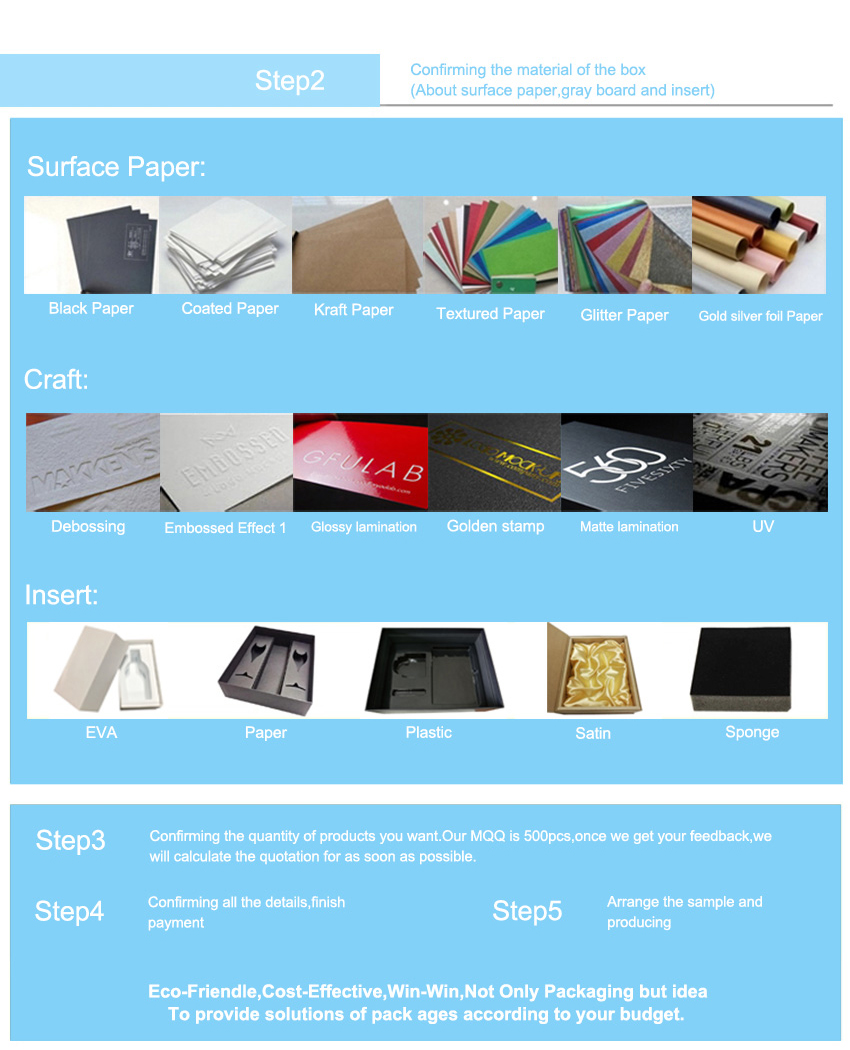 5). Opcja: Laminowanie błyszczące i matowe; Moc brokatu; Złote/srebrne tłoczenie na gorąco; Powłoka UV; Sitodruk; Tłoczenie wklęsłe i wklęsłe; Lakier błyszczący