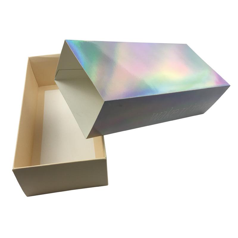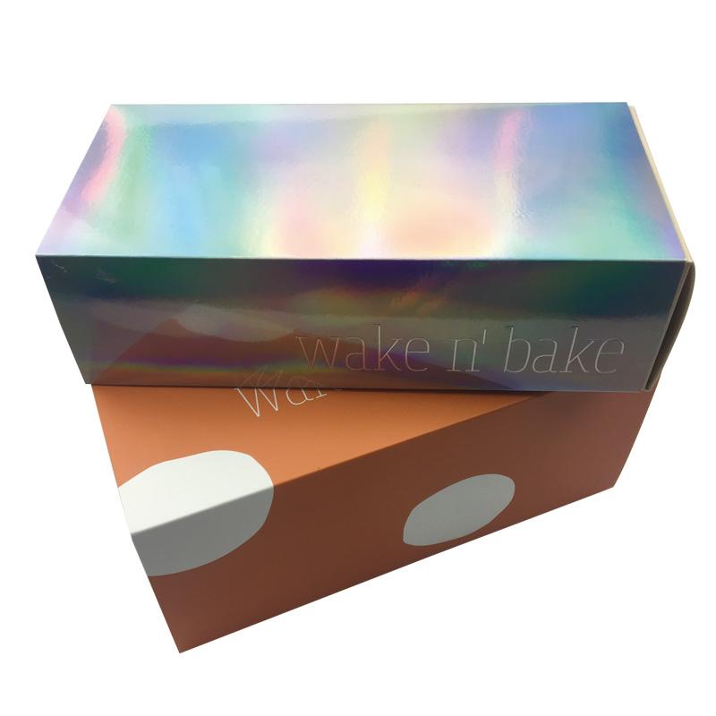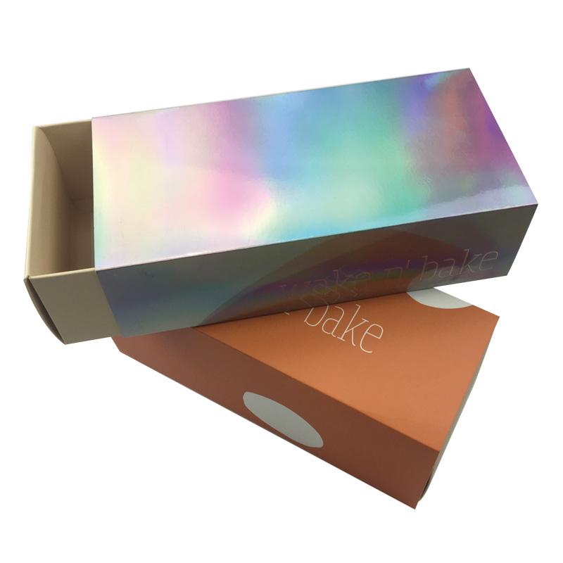 Popularny projekt składanego pudełka z szufladą, z nadrukowanym logo, wykonanego z białej tektury o gramaturze 350 g/m2, z gramaturą 25 g/m2 lub bez Powierzchnia pokryta folią holograficzną. Jest to tańsze rozwiązanie niż sztywne kartonowe pudełka szufladowe, a dodatkowo pozwala zaoszczędzić na kosztach wysyłki.