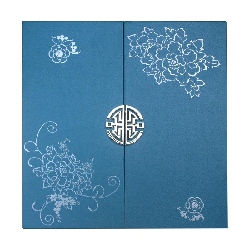 wykończenie pudełka: Nadruk w kolorze niebieskim Pantone, laminowanie folią matową, tłoczenie, złocenie na gorąco folią,