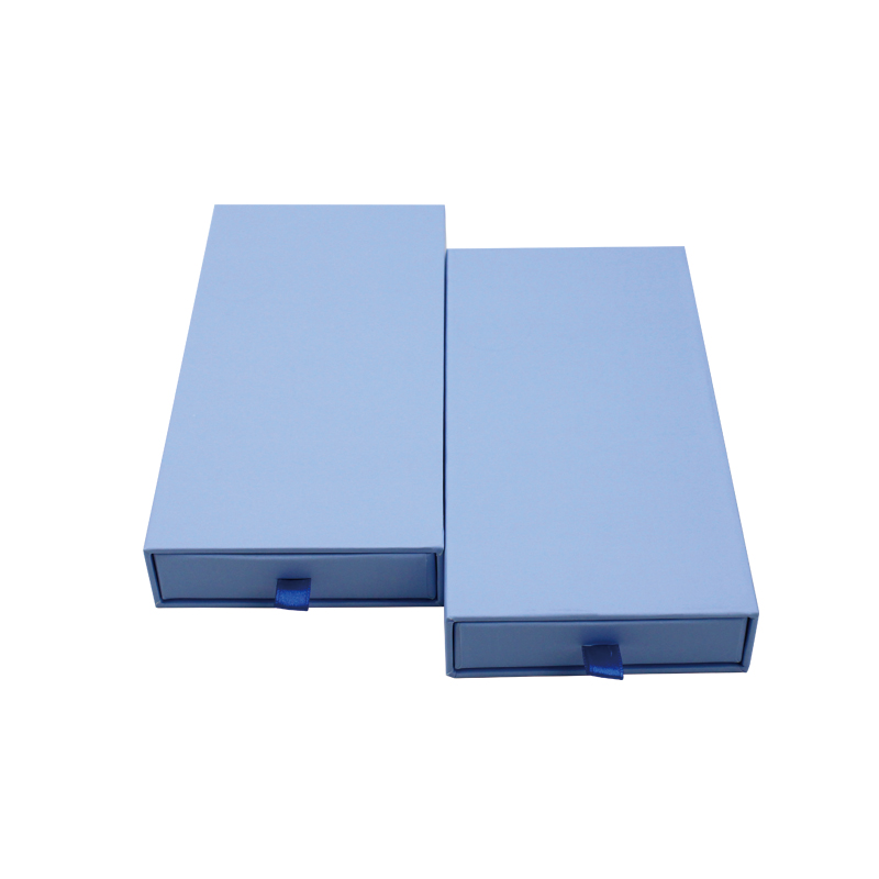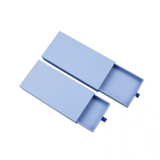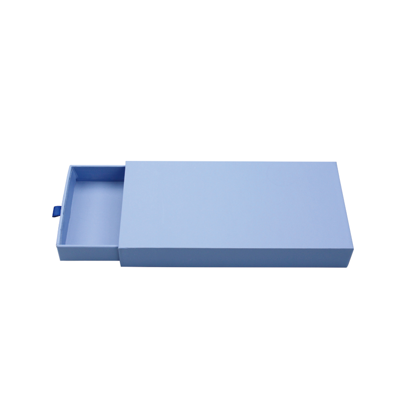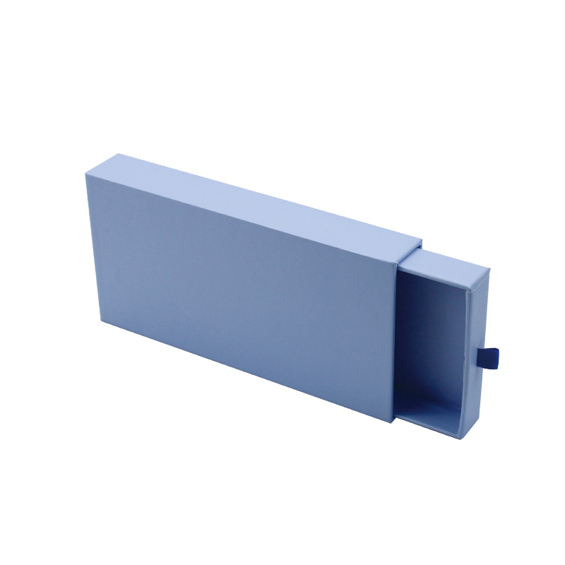 To jest niebieski ślizgać się D szuflada na żywność skrzynka z ściągaczem wstążki który zrobił z papieru artystycznego C2S 157g + szarej tektury 1200g Całe pudełko jest pokryte jednolitym, niebieskim nadrukiem, bez żadnych wzorów.