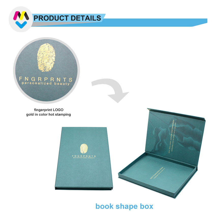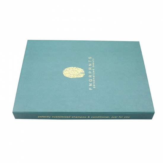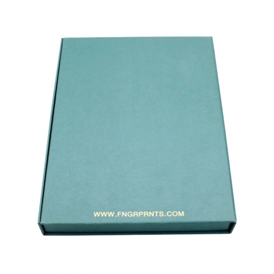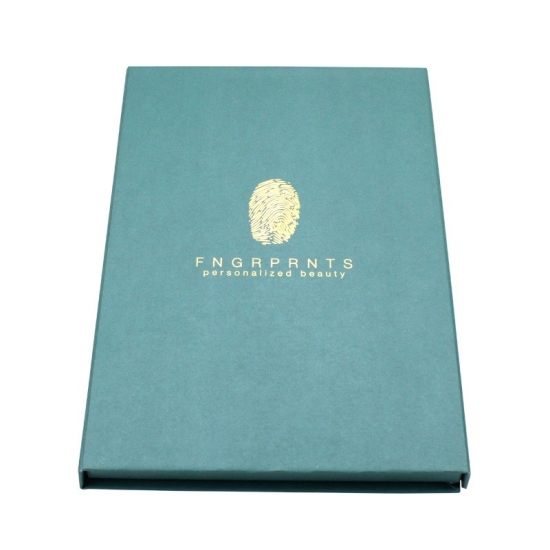 Zielone tekturowe pudełko magnetyczne wykonane z papieru artystycznego C2S o gramaturze 157 g/m2 laminowanego szarą tekturą o grubości 2 mm. Możliwość dostosowania rozmiaru, koloru i logo. Powierzchnia wykończona matową laminacją, nadruk CMYK metodą złocenia na gorąco. Rozmiar 22,3*16*2 cm.