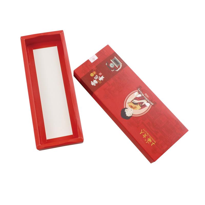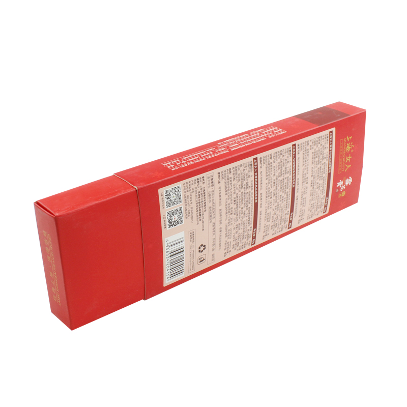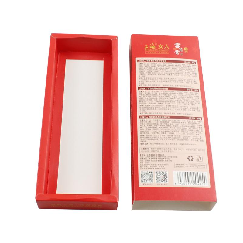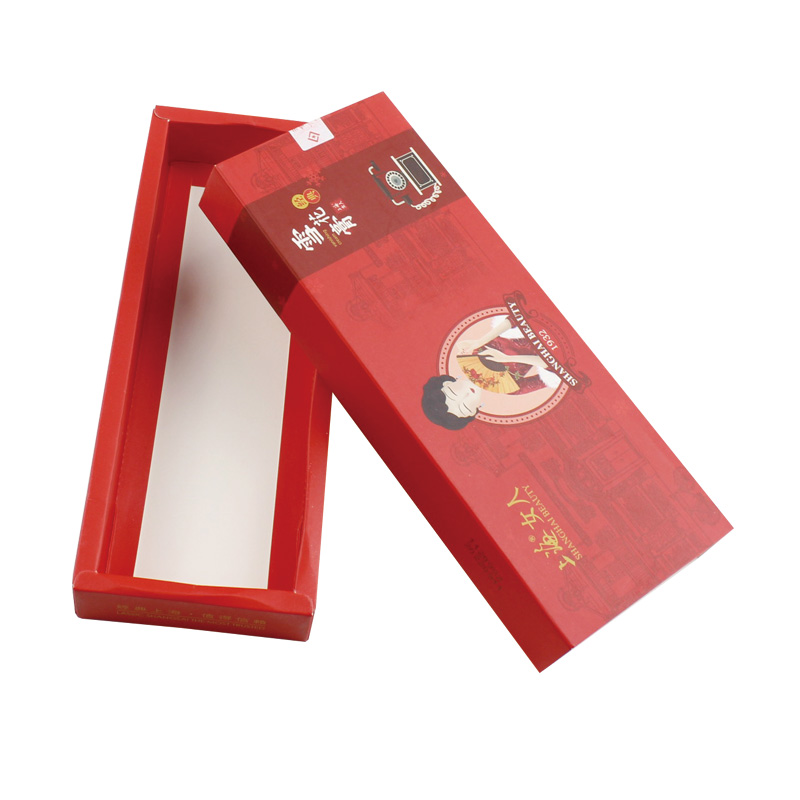 To jest płaskie pudełko szufladowe który zrobił z papieru artystycznego powlekanego jednostronnie o gramaturze 350 g ,pełne matowe czerwone nadruki na całym pudełku z logo i tekstem.
