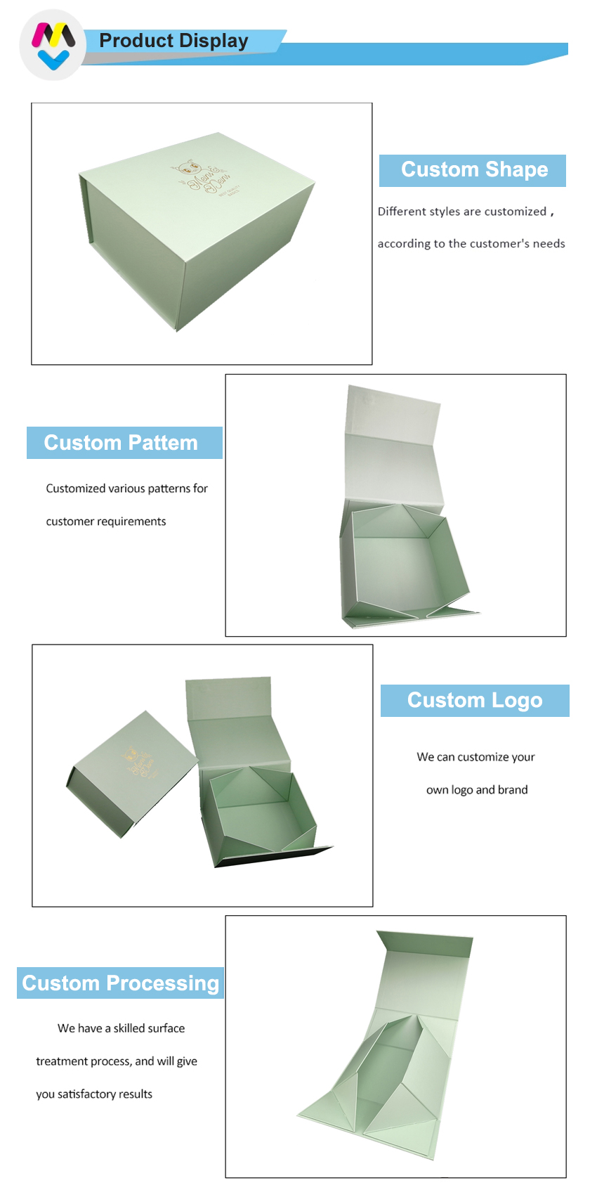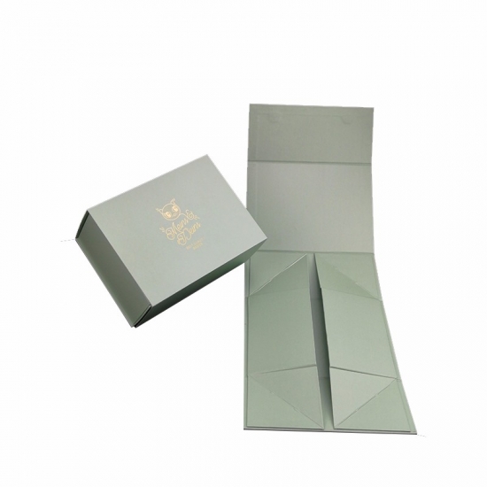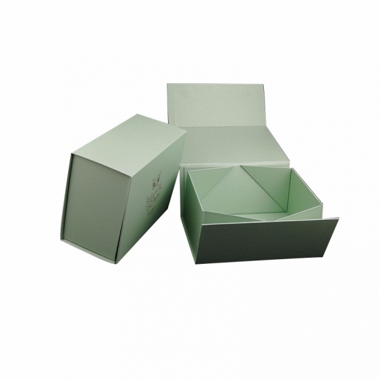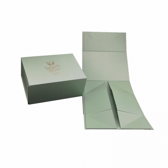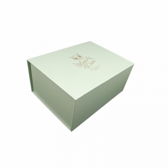 To jest zielony kolor składane pudełka papierowe który zrobił na papierze kredowym C2S o gramaturze 157 g + szarym kartonie o gramaturze 1200 g, pełnokolorowy nadruk na zewnątrz i wewnątrz pudełka, logo wytłoczone złotą folią.