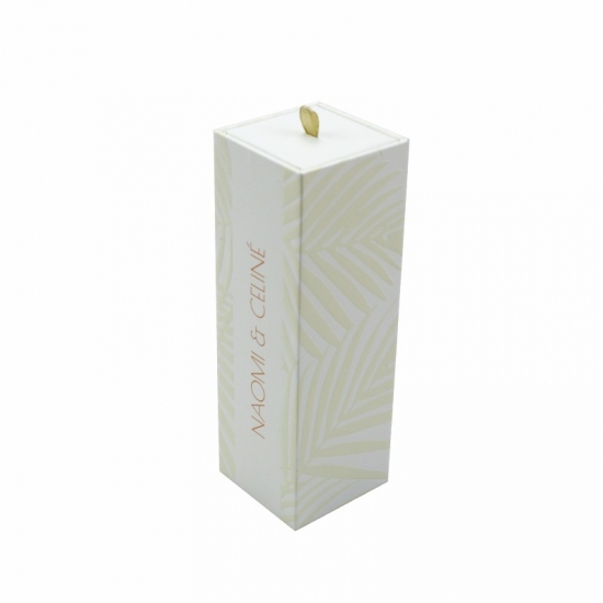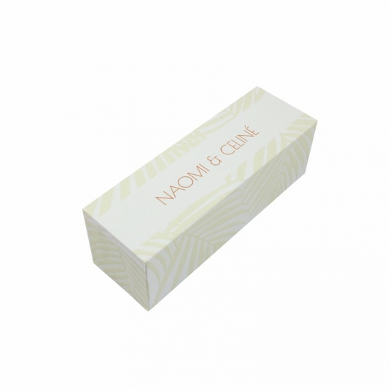 Jasnożółta powierzchnia z ornamentem w kształcie liści i czerwonym logo z folii, bardzo delikatne, zaprojektowane na zamówienie pudełko na kosmetyki i produkty do pielęgnacji skóry z szufladką. Wykonane z papieru artystycznego 157 g + szarego kartonu, wytłoczony wzór liści + matowa laminacja ze wstążką.