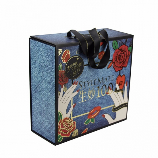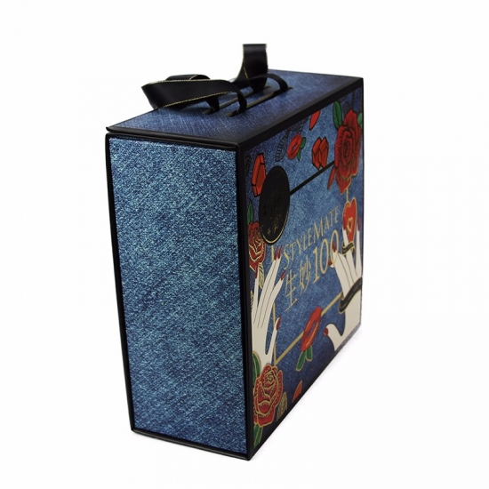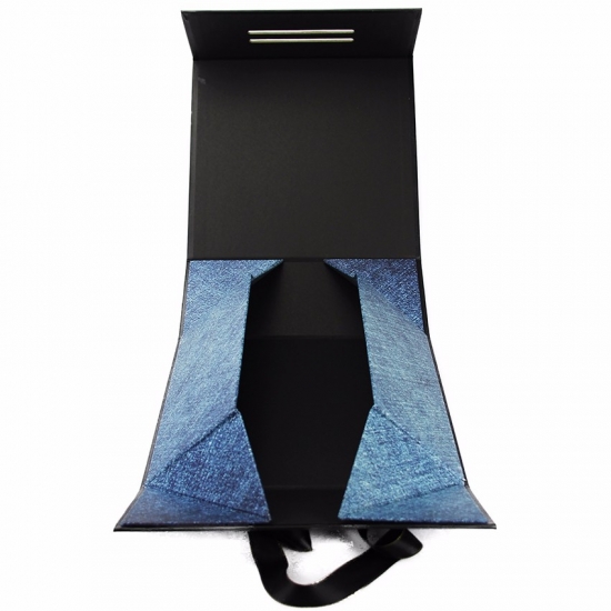 Normally 15-20 days after design/samplePudełko składane z wzorem denimu i wstążką grosgrainową oraz uchwytem linowym