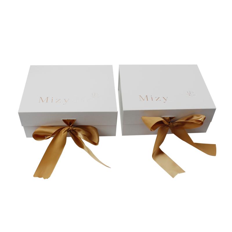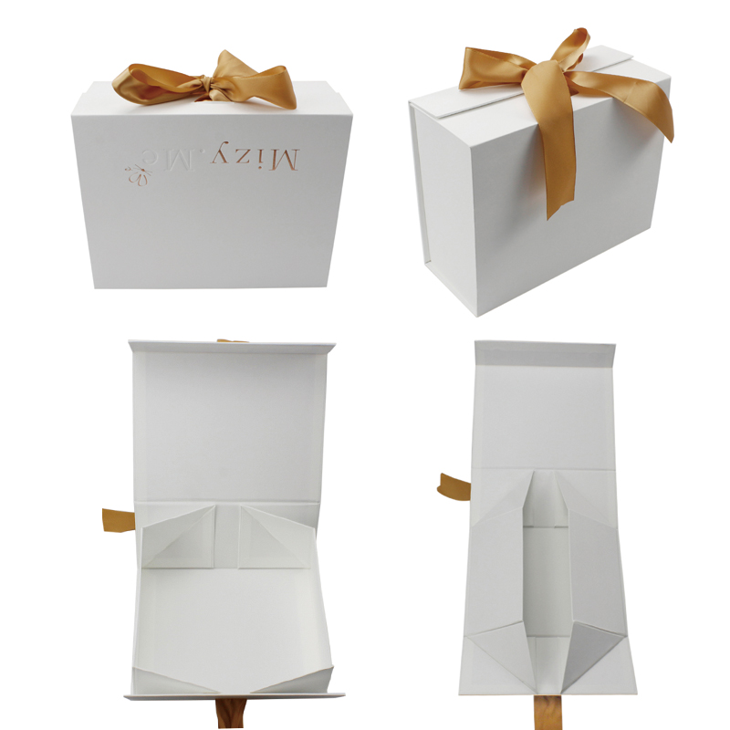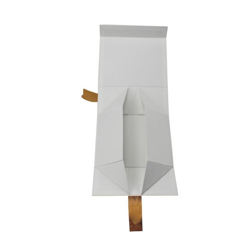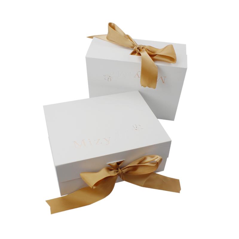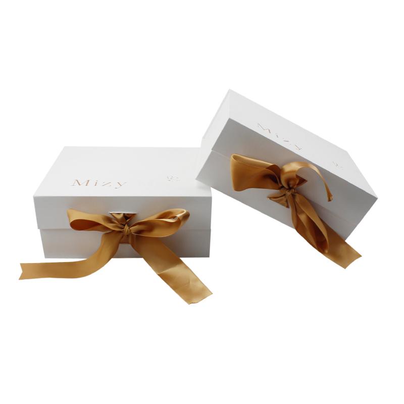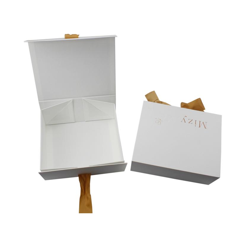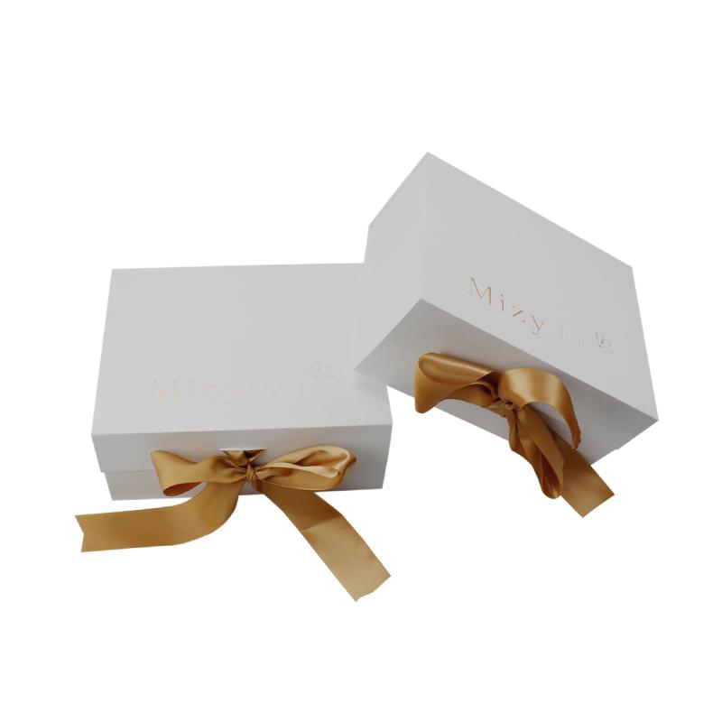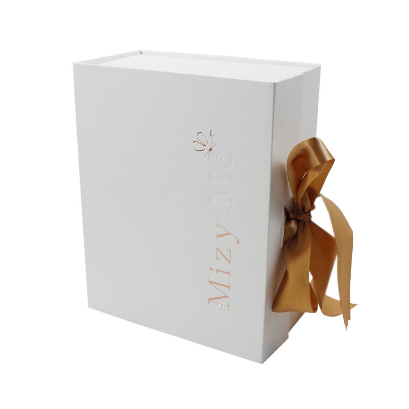 To jest białe magnetyczne pudełka prezentowe który zrobił ze specjalnego papieru i szarego kartonu 1200g, logo wytłoczone złotą folią na zewnątrz pudełka, a dołączone zamknięcie w postaci wstążki w kolorze dopasowanym do koloru logo, gładkie białe, bez nadruku wewnątrz pudełka. Możemy dostosować rozmiar do Państwa życzeń.