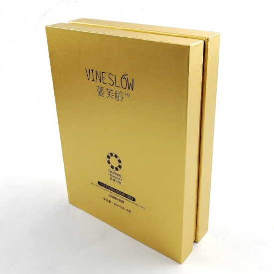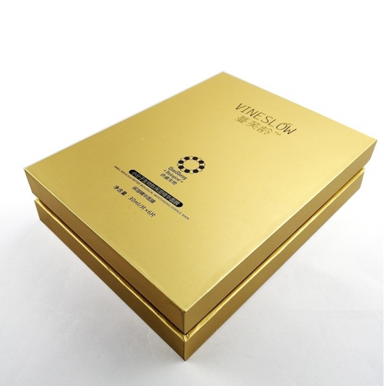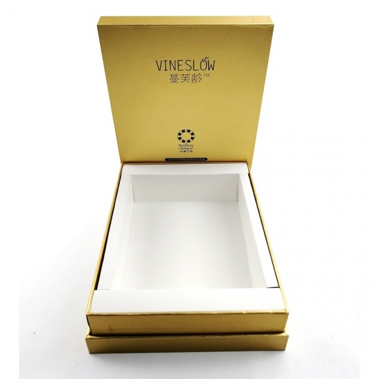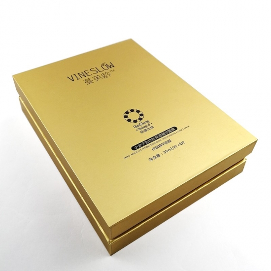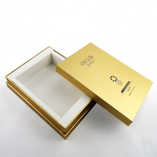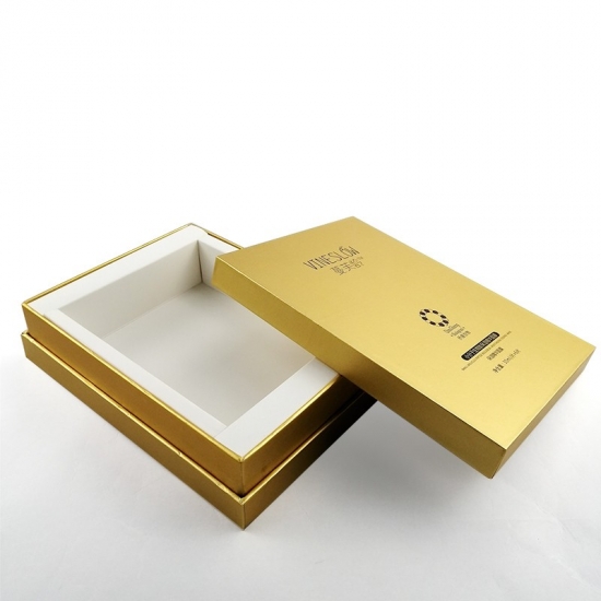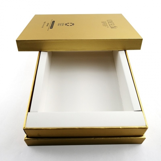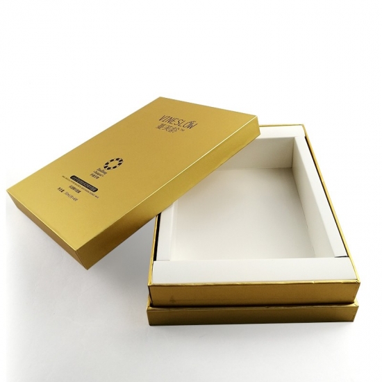 To duże, czarne pudełko prezentowe z logo i pokrywką, wykonane przez złoty papier specjalistyczny + 1200g szara tektura, wnętrze pudełka wyściełane jest wkładką z tektury.