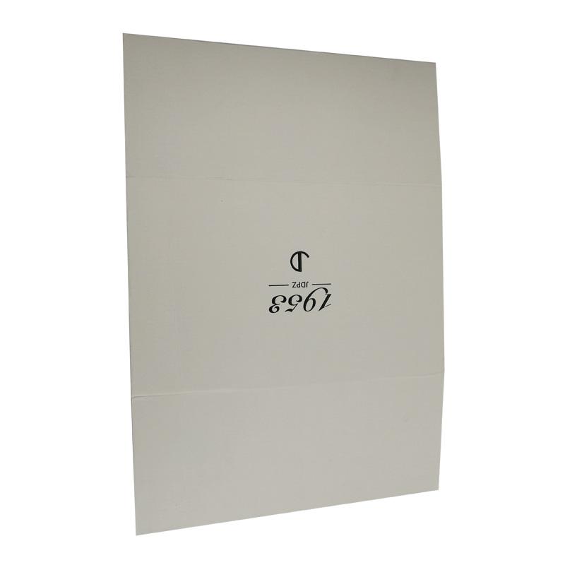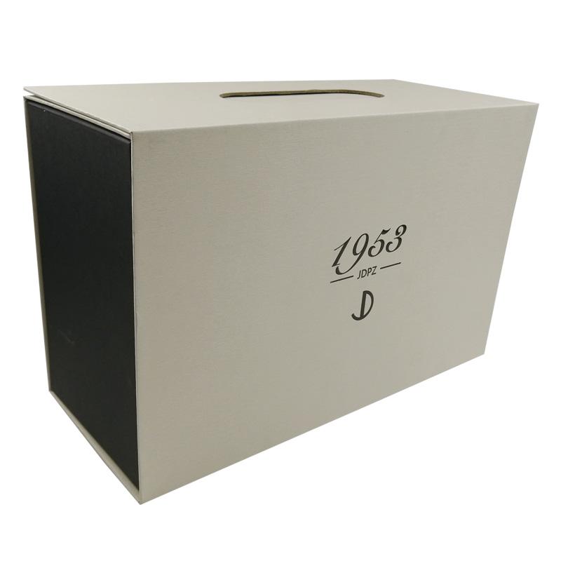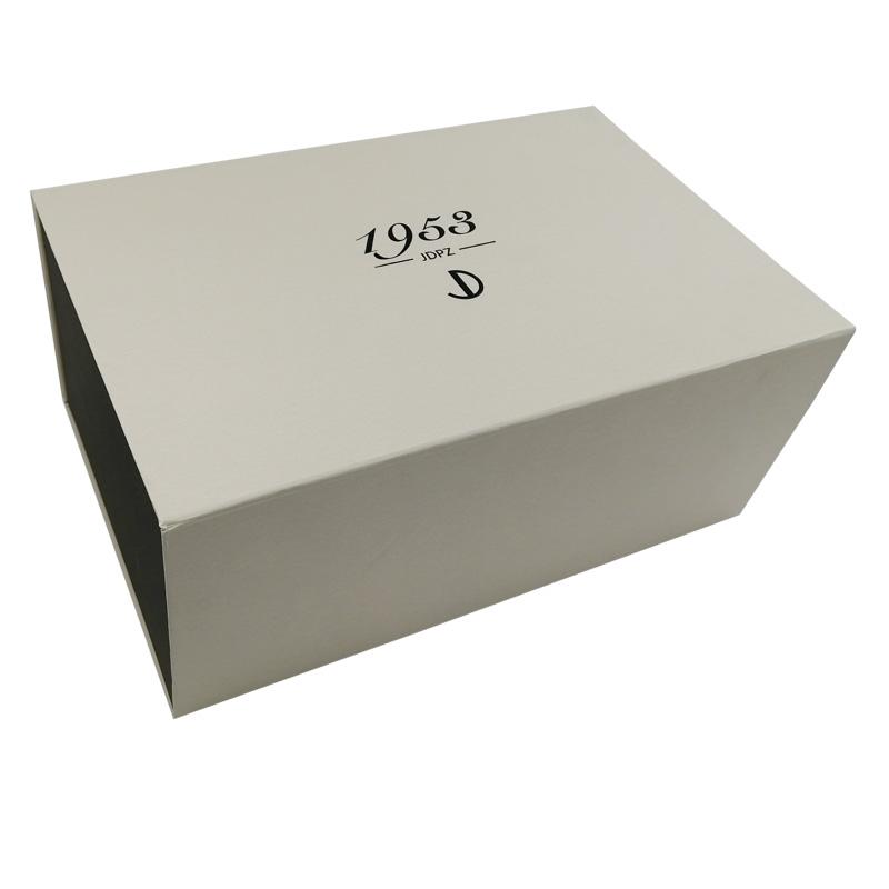 To jest biały duże składane pudełka który zrobił na papierze kredowym C2S o gramaturze 157 g + szarym kartonie o gramaturze 1200 g, pełnokolorowy nadruk na zewnątrz pudełka z wytłoczonym logo oraz wnętrze pudełka w kolorze czarnym.