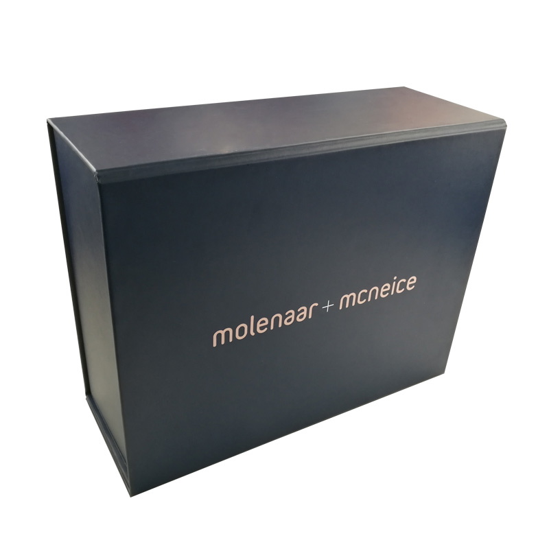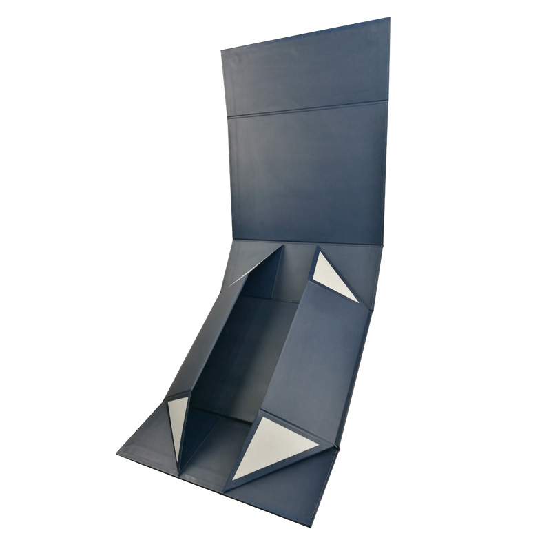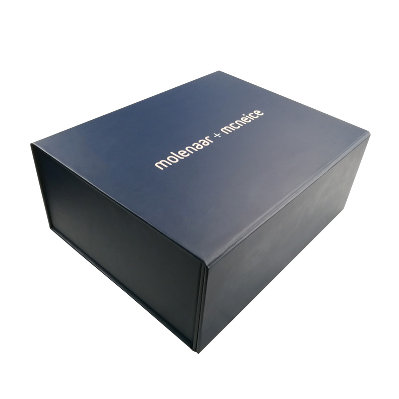 To jest matowy niebieski kolor duże płaskie pudełka składane który zrobił na papierze artystycznym C2S o gramaturze 157 g + szarym kartonie o gramaturze 1200 g, pełnokolorowy nadruk na zewnątrz i wewnątrz pudełka, logo wytłoczone złotą folią, na czterech rogach podstawy pudełka znajdują się podwójne taśmy klejące.