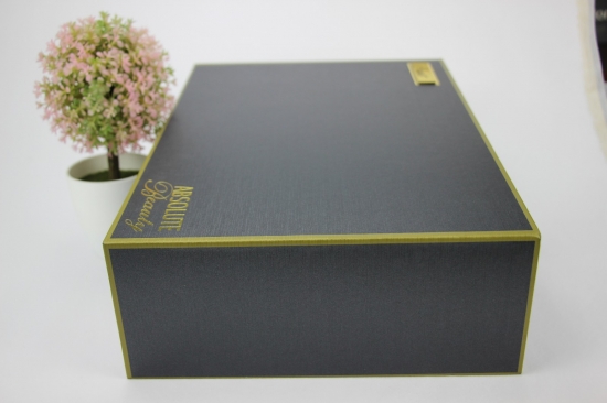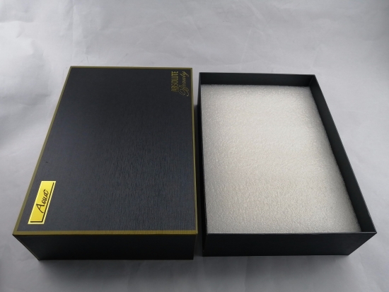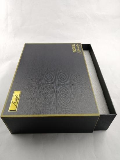 Luksusowe, najwyższej jakości, wyściełane gąbką, przesuwane pudełko kartonowe na wino, z tekturowym obramowaniem i wysuwaną szufladką ze złotą folią i logo.
