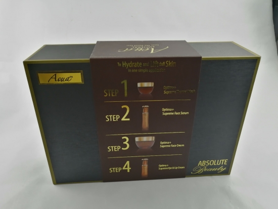 Niestandardowe pudełko prezentowe na sprzęt kosmetyczny z pokrywką, z przezroczystym okienkiem prezentacyjnym z tworzywa PVC na pokrywce Wewnątrz pudełka znajduje się specjalnie zaprojektowana biała wyściółka EVA.