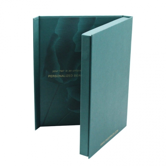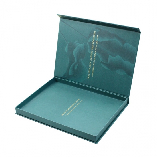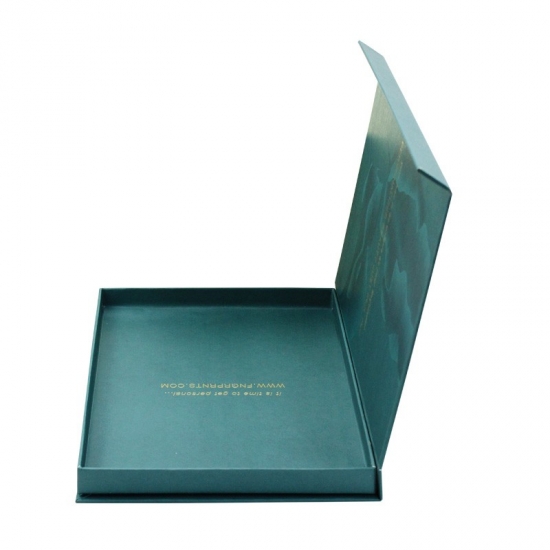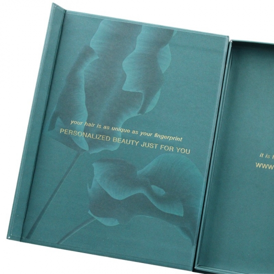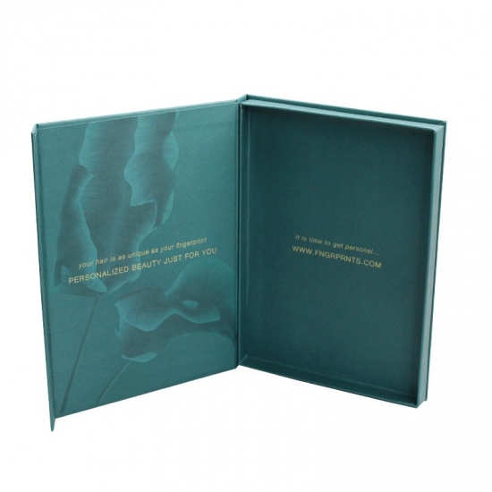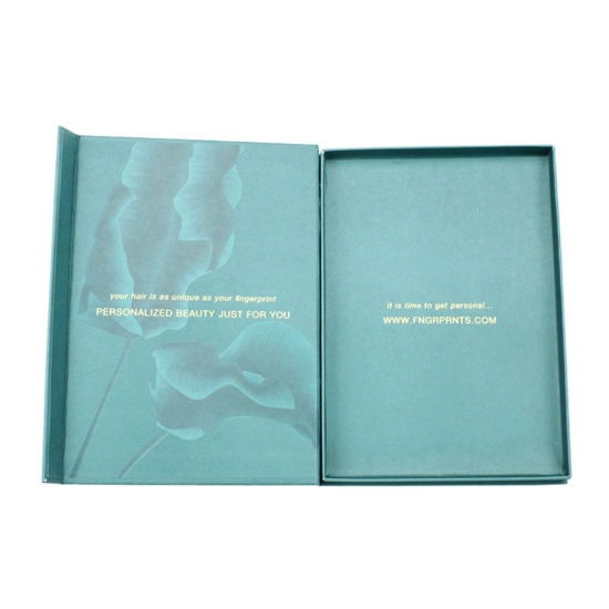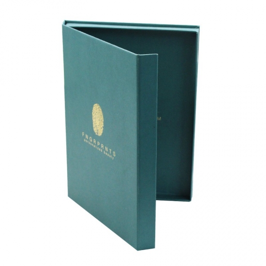 To dostawca magnetycznych pudełek prezentowych który zrobił z papieru artystycznego C2S o gramaturze 157 g + szarego kartonu o gramaturze 1200 g, logo w postaci odcisku palca na pokrywie wykonane jest za pomocą tłoczenia złotą folią.