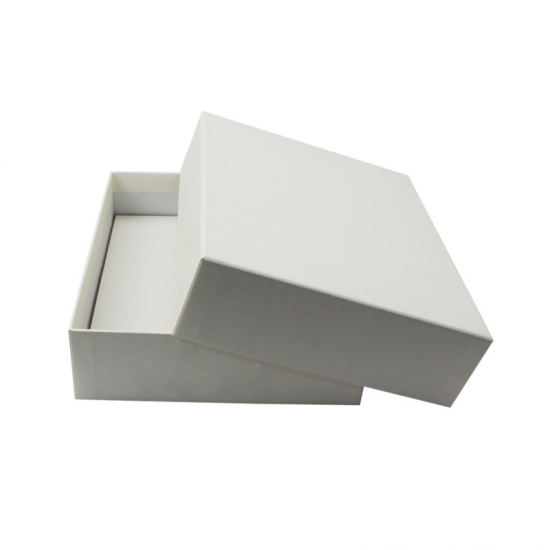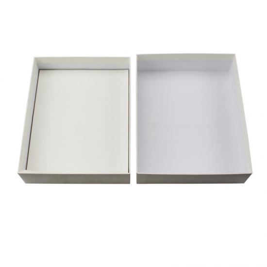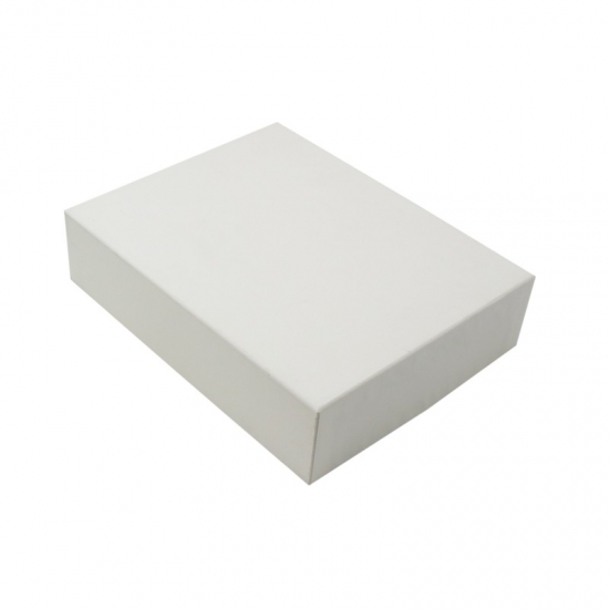 Pudełko wykonane jest z powlekanego papieru kredowego o gramaturze 157 g/m2 i szarej tektury o grubości 2 mm. Wymiary pudełka to 16 x 12 x 3 cm, używane głównie do pakowania. Jest ono w kolorze czystej bieli, bez logo. Styl jest prosty.
