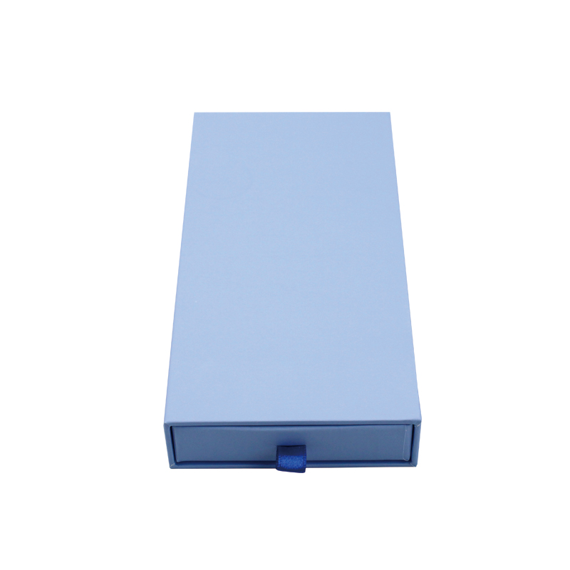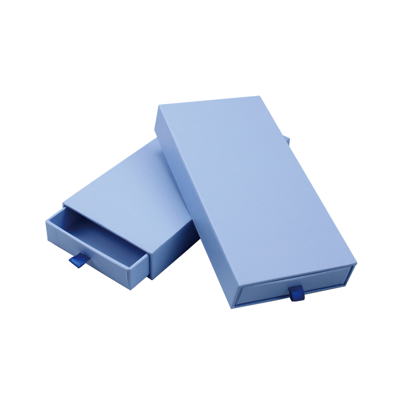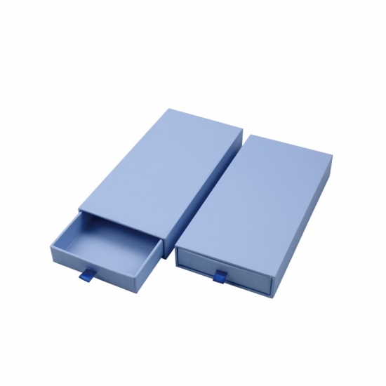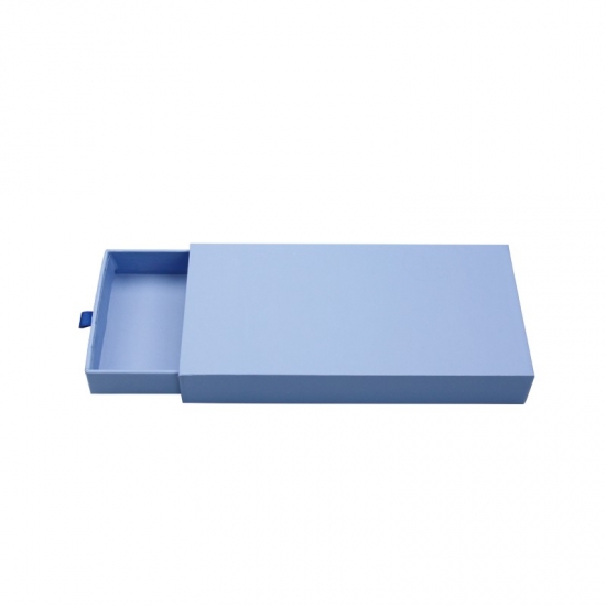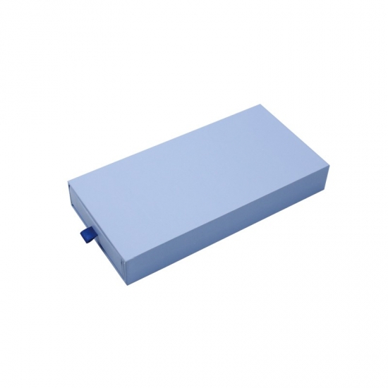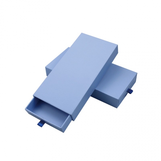 To matowy niebieski kolor proste niebieskie pudełko z szufladą który zrobił z papieru artystycznego C2S 157g + szarej tektury 1200g ,pełne niebieskiego nadruku na zewnątrz i wewnątrz, bez logo, matowe wykończenie powierzchni.