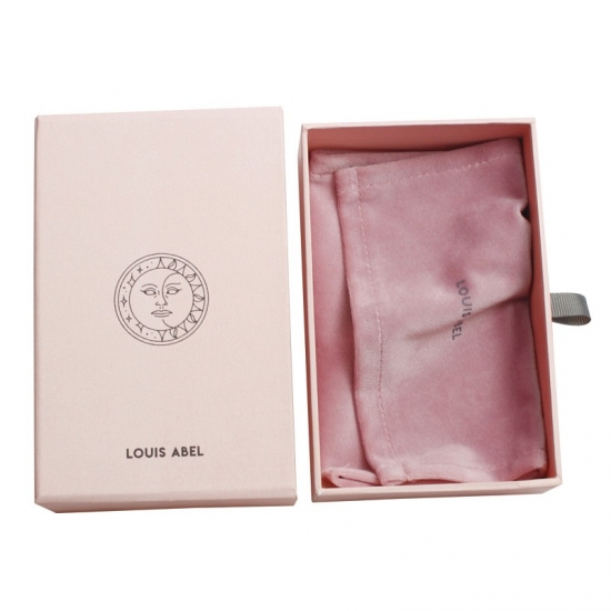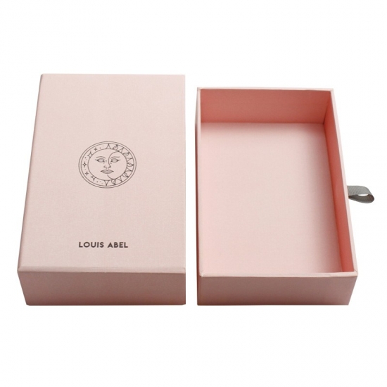 To jest różowa szuflada na biżuterię który zrobił ze specjalnego papieru + 1200g szarego kartonu, wewnątrz pudełka znajduje się spersonalizowana torebka z nadrukowanym sitodrukiem czarnym logo, jest to rodzaj przesuwanego pudełka prezentowego.