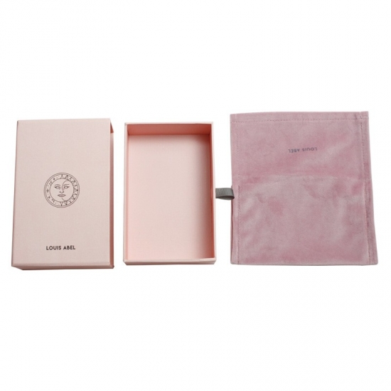 Niestandardowe różowe pudełko na biżuterię z szufladą i woreczkiem, to rodzaj opakowanie prezentowe w formie przesuwanego pudełka.