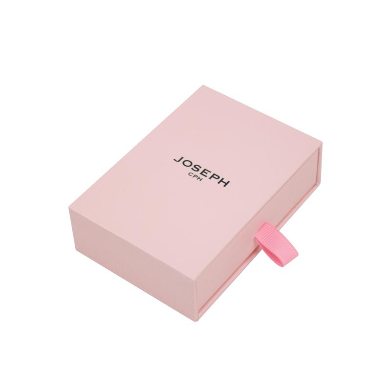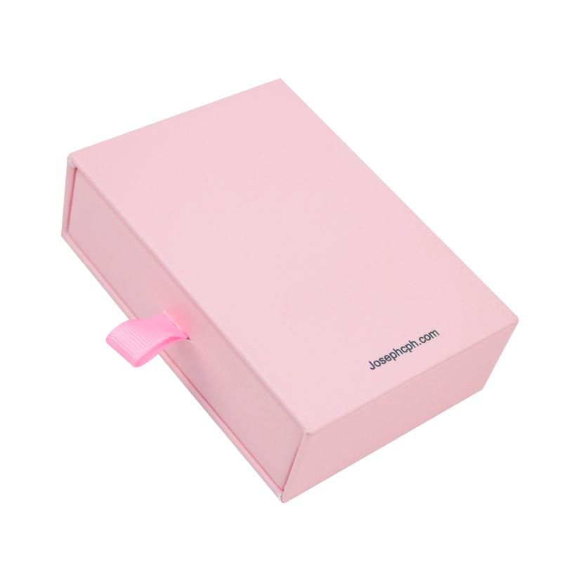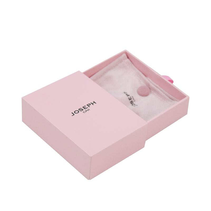 To jest szuflada na biżuterię który zrobił z różowego specjalistycznego papieru teksturowanego + 2 mm szarej tektury ,pełen różowy nadruk z przodu i z tyłu z logo i tekstem, woreczek z wysokiej jakości aksamitu zawiera to samo logo co pudełko.