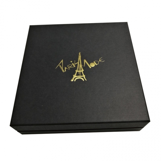 To pudełko prezentowe z pokrywkami wykonane jest z czarnego, tłoczonego kartonu o gramaturze 120 g/m2 z logo wykonanym metodą hot-stampingu, wykonanym ze złotej folii. Ramię wykonane jest z złotego kartonu o gramaturze 153 g/m2, który komponuje się ze złotym logo, nadając mu elegancki wygląd. Wewnątrz znajdują się również 4 małe pudełka wykonane z tego samego materiału i wykończone, służące do pakowania różnych przedmiotów, aby wręczyć wyjątkowe prezenty klientom lub przyjaciołom.