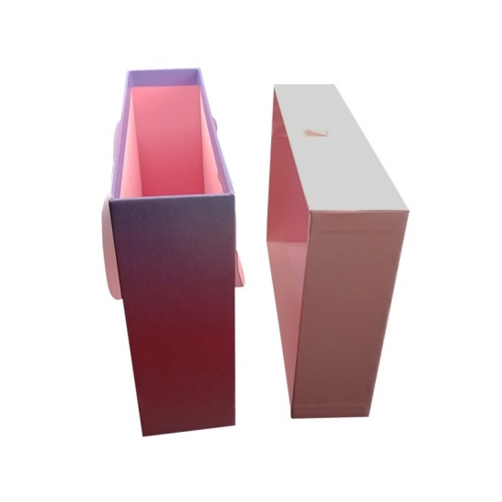 To różowe, duże, wysuwane pudełko na prezent z romantyczną szufladą i wstążeczką który zrobił z papieru artystycznego C2S 157g + szarej tektury 1200g ,na zewnątrz pudełka nadruk w pełnym wzorze graficznym,podstawa pudełka gładki różowy nadruk z matowym wykończeniem.