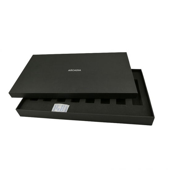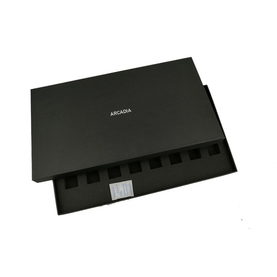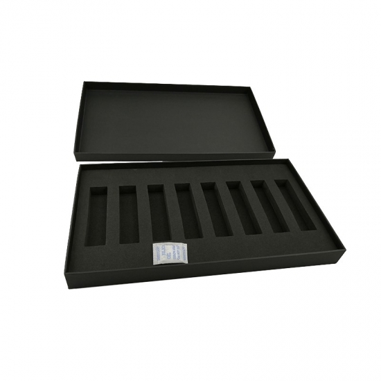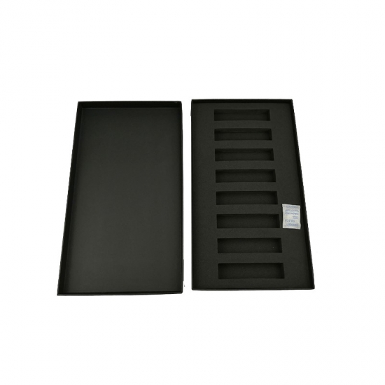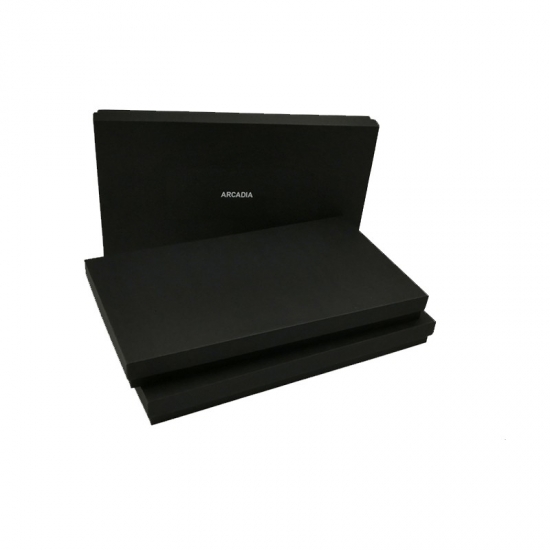 To pudełko jest wykonane z czarnego kartonu o gramaturze 120 g/m2, laminowanego wysokiej jakości sztywną płytą wiórową o gramaturze 1200 g/m2. Projekt pudełka jest prosty i czysty, z logo firmy tłoczonym na gorąco, ale samo pudełko prezentuje się bardzo elegancko. Bardzo stonowane i luksusowe, mile widziane zarówno w Europie, jak i Ameryce.