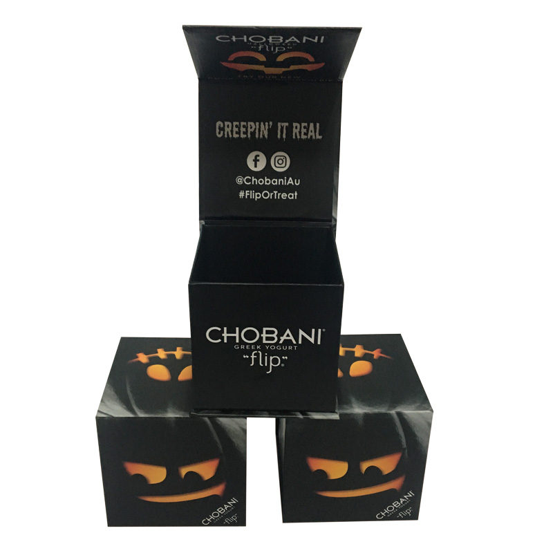 To jest czarny kolor sztywne, składane pudełko który zrobił na papierze kredowym C2S o gramaturze 157 g + szarym kartonie o gramaturze 1200 g, z kolorowym nadrukiem dyni po obu stronach pudełka.