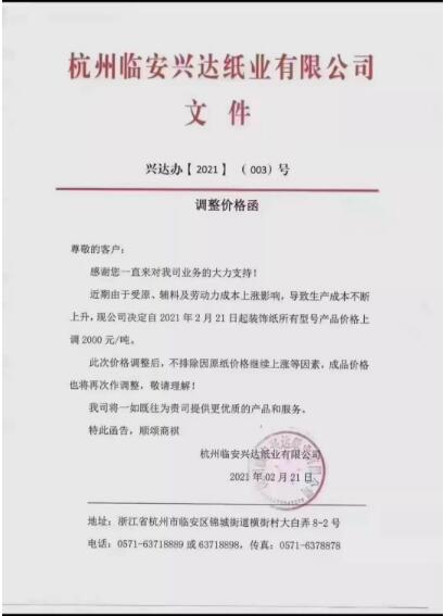 21 lutego firma Hangzhou Lin'an Xingda Paper Co., Ltd. opublikowała list z informacją o podwyżce cen, w którym poinformowała o wzroście kosztów produkcji spowodowanym wzrostem cen surowców, materiałów pomocniczych i kosztów pracy. Firma podniesie ceny wszystkich rodzajów papieru dekoracyjnego.