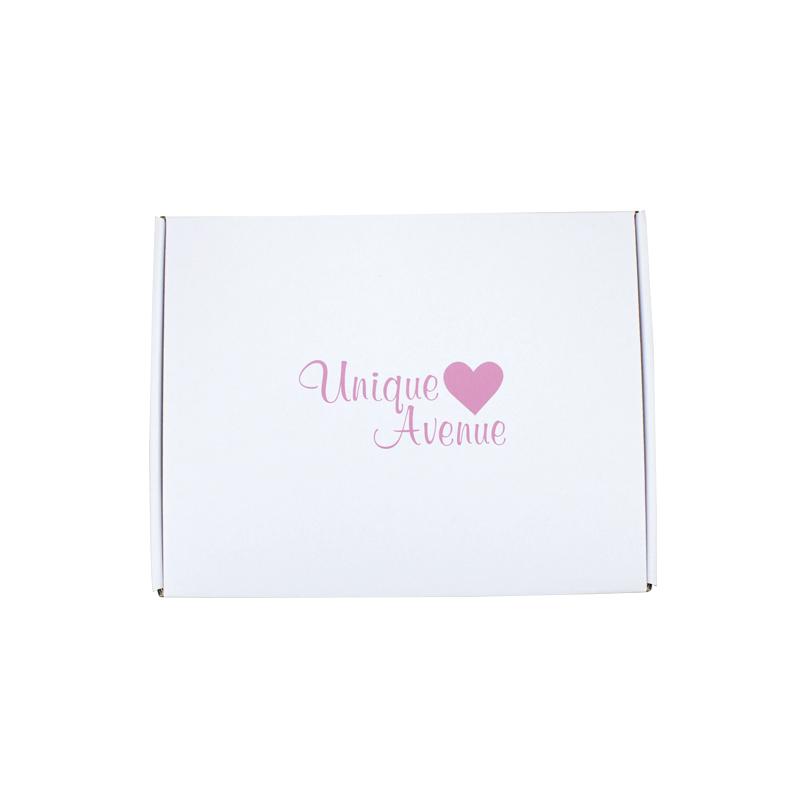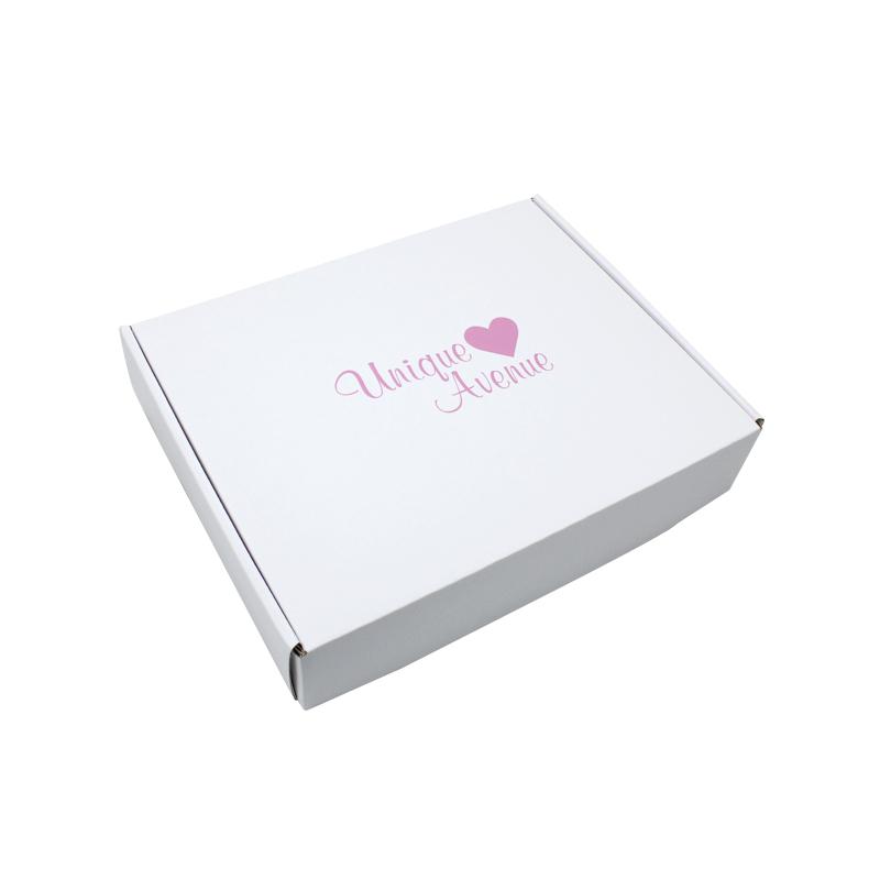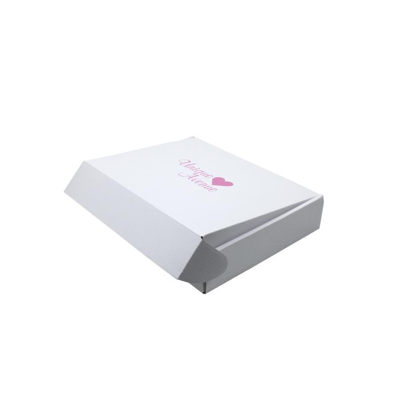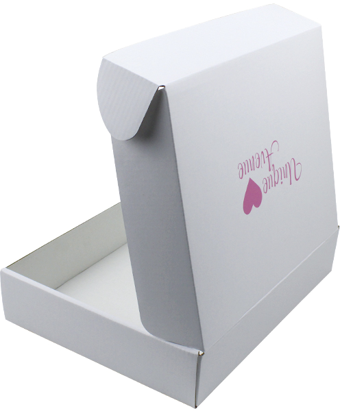 To białe, 3-warstwowe pudełko z tektury falistej, wykonane z 300-gramowej tektury CCNB+WE, nadaje się do płaskiego pakowania przesyłek pocztowych. Logo jest nadrukowane w kolorze różowym na środku górnej części pudełka.