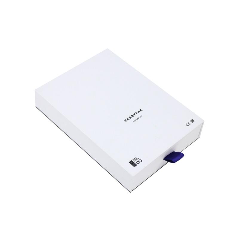 Luksusowe, sztywne pudełko z szufladą z papieru, z wysokiej jakości nadrukiem i wykończeniem. Otwierane za pomocą dedykowanych wycięć i wstążek.