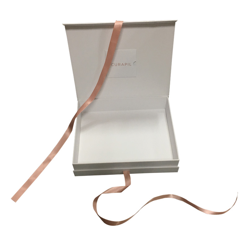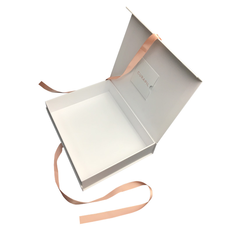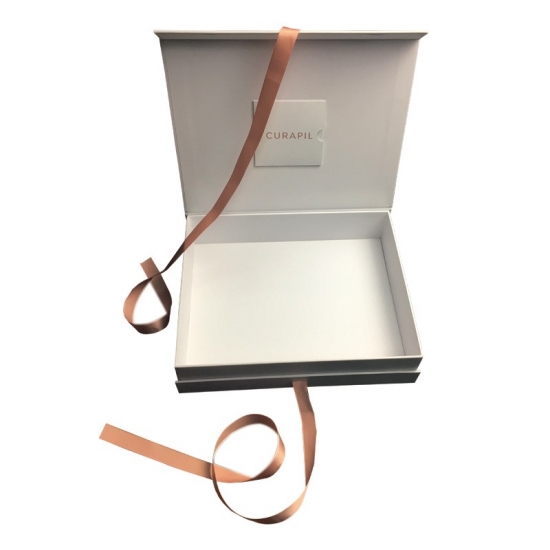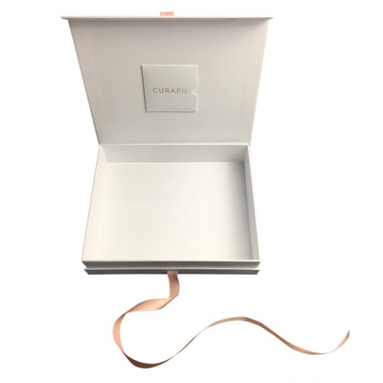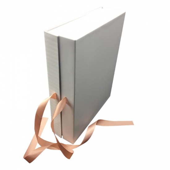 To jest biały magnetyczne pudełko prezentowe ze wstążką który zrobił z papieru artystycznego C2S o gramaturze 157 g + 2 mm szarego kartonu, zewnętrzna strona pudełka pokryta warstwą lakieru UV, która nadaje pudełku błyszczący i luksusowy wygląd, wewnątrz pokrywy znajduje się mała koperta do włożenia karty.