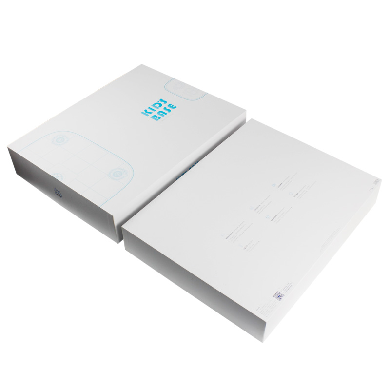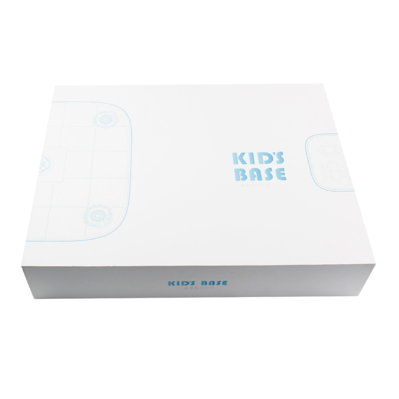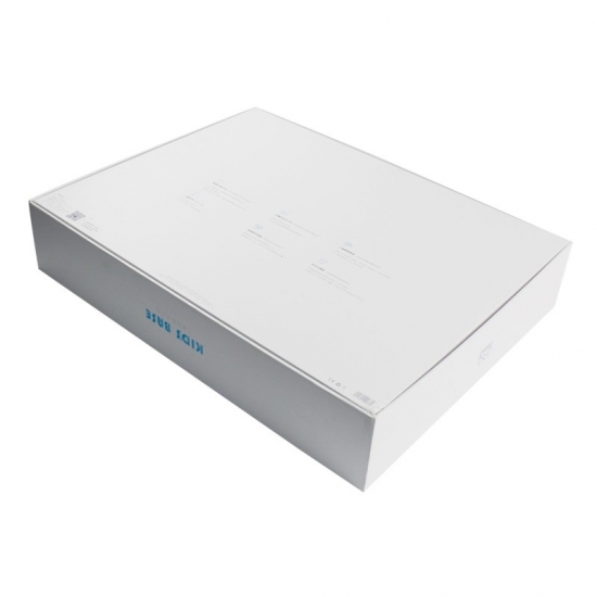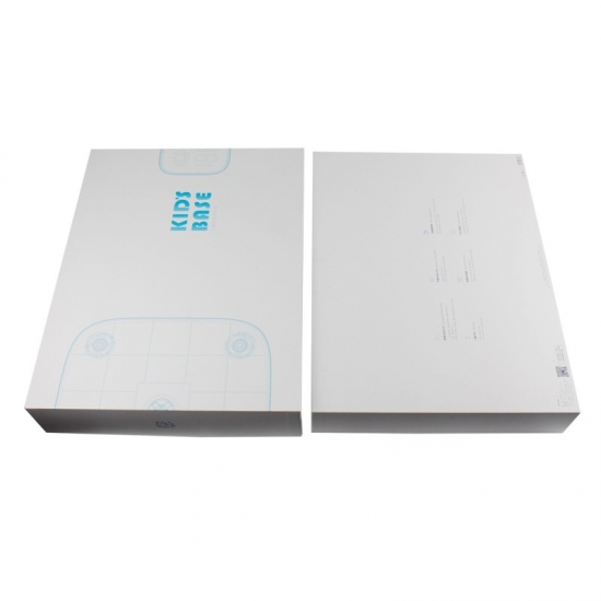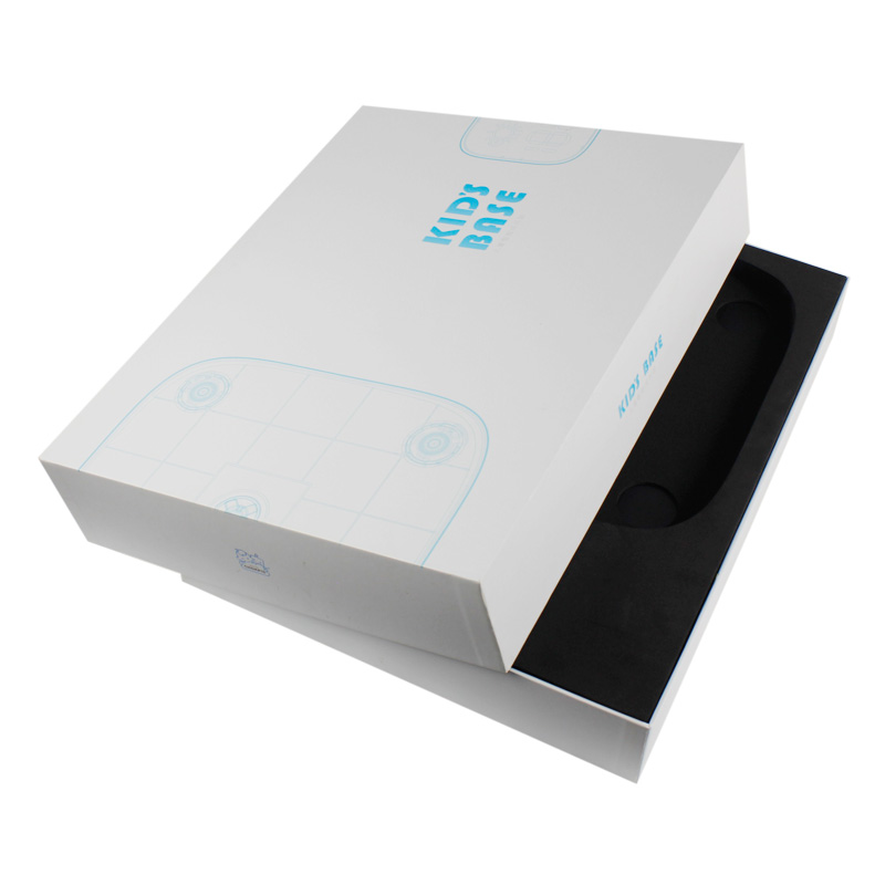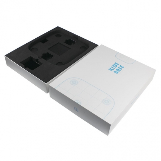 To jest góra i dół skrzynka który zrobił papier artystyczny C2S 157g + szary karton 1200g, nadruk z niebieskim logo na pudełku, wnętrze pudełka wyściełane czarną gąbką o niestandardowym kształcie.